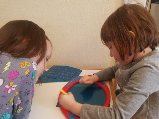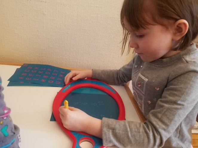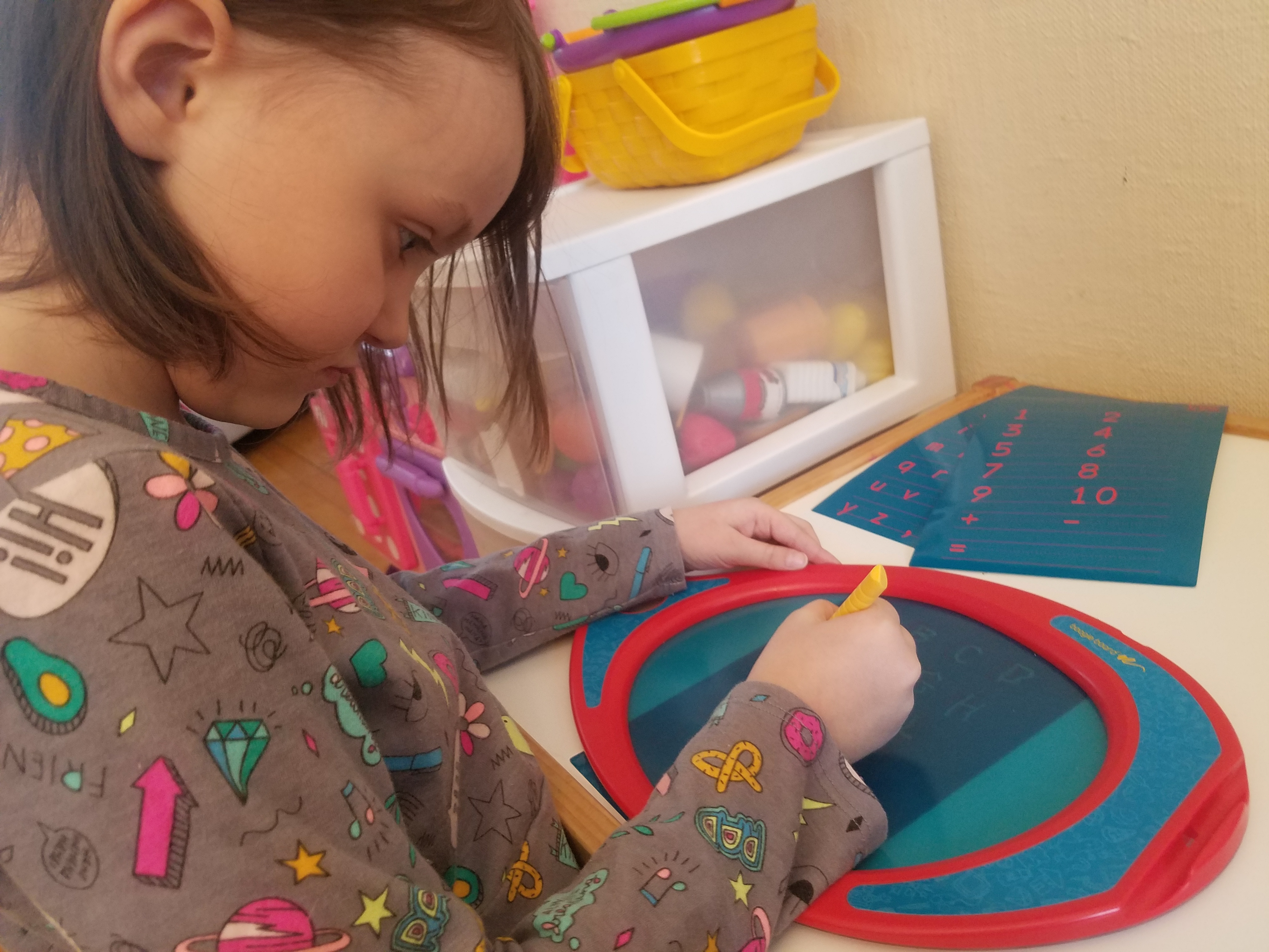 Sophia used the Play n’ Trace Boogie Board first. She wanted to trace the card with numbers. Katie leaned in to watch Sophia and encourage her as she traced the numbers. Sophia did a really good job and only messed up couple times. Sophia struggles sometimes with writing and I’m really proud of her on how well she worked on the tracing card. She has been working really hard on writing letters and numbers at Preschool couple days a week.