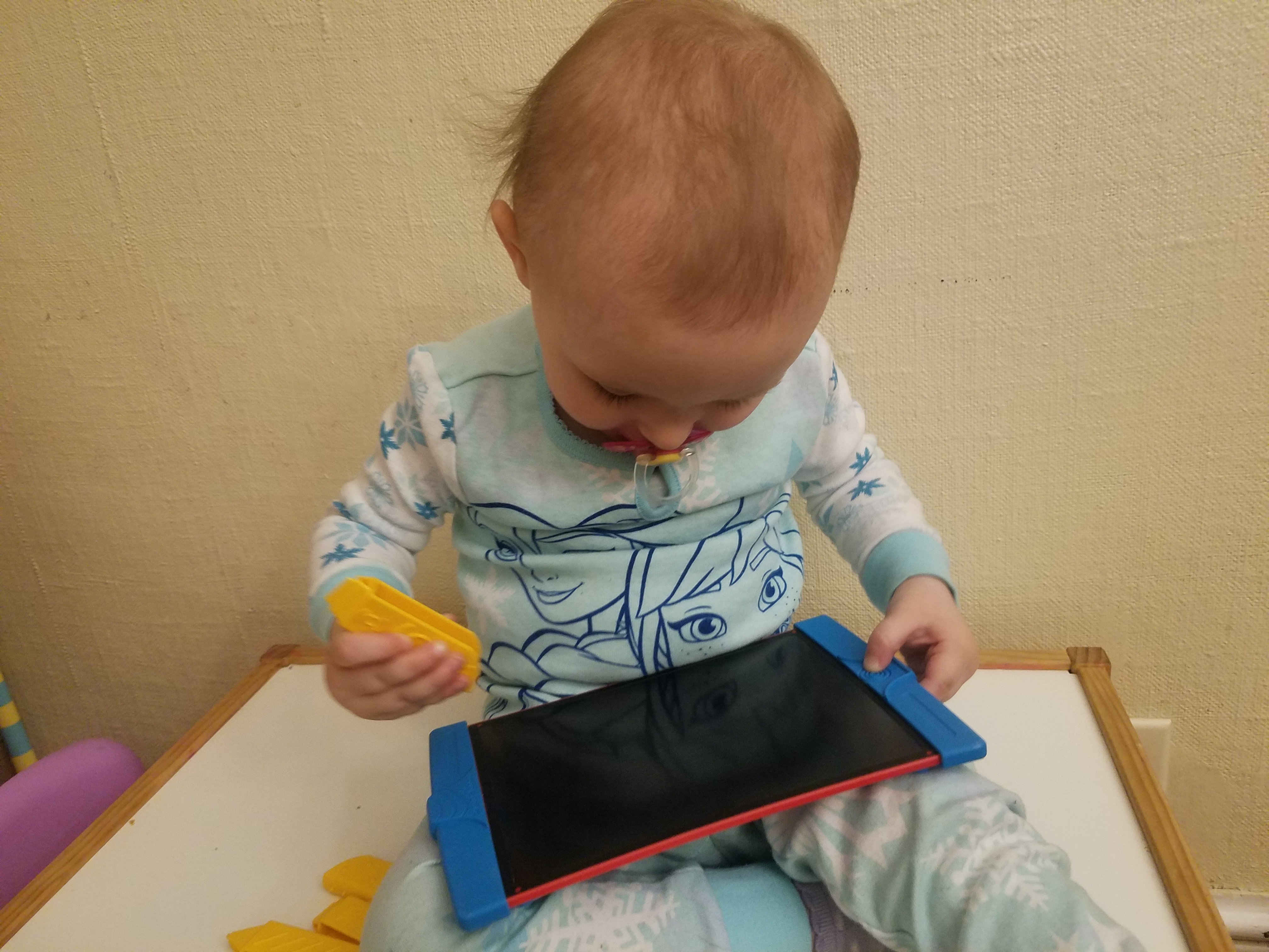Elizabeth took her turn on the Play n’ Trace Boogie Board. She had fun scribbling on the tablet. Then she got distracted by me taking pictures of her and wanted to see them. Besides drawing on the Boogie Boards, Elizabeth also loves to draw on the marker board.