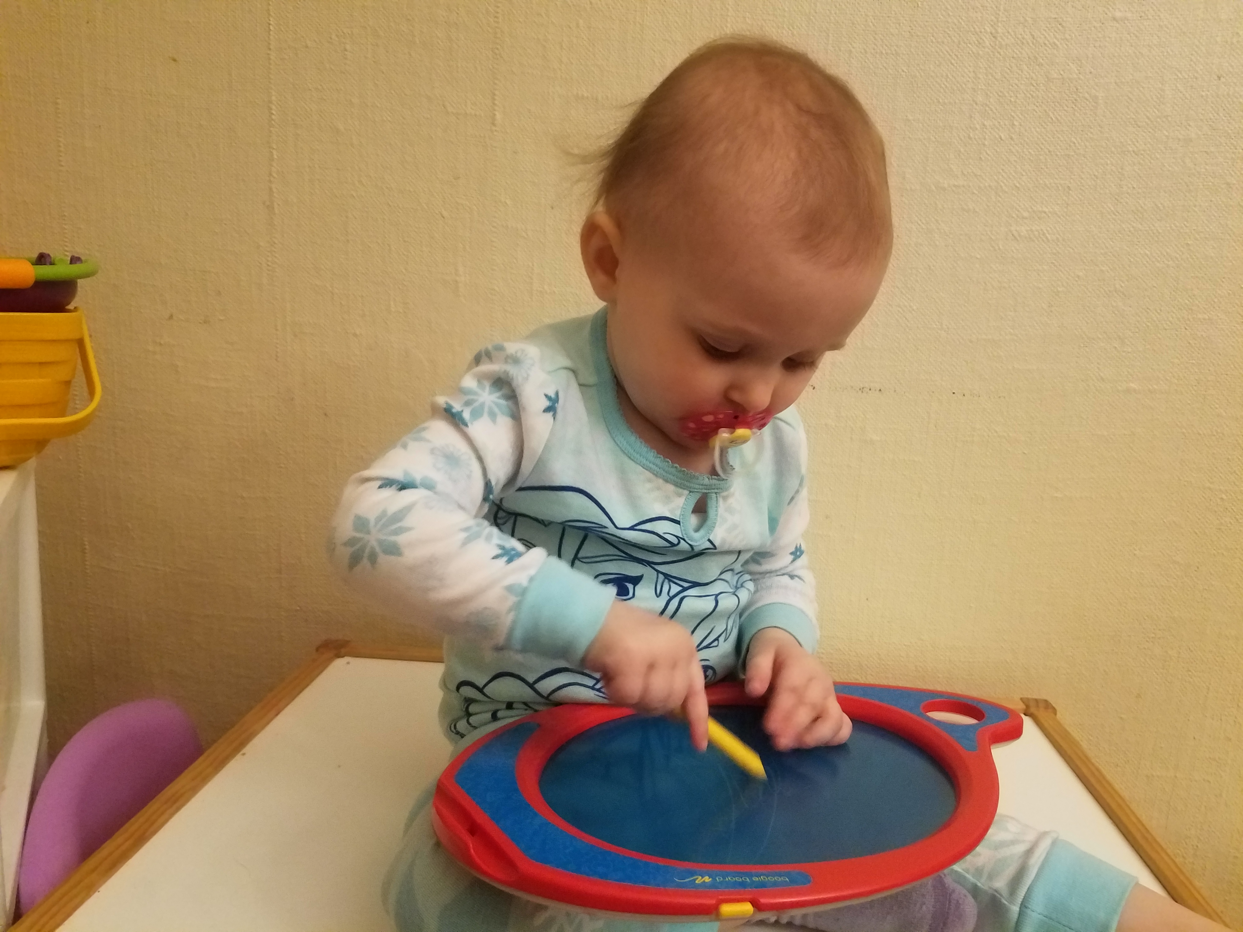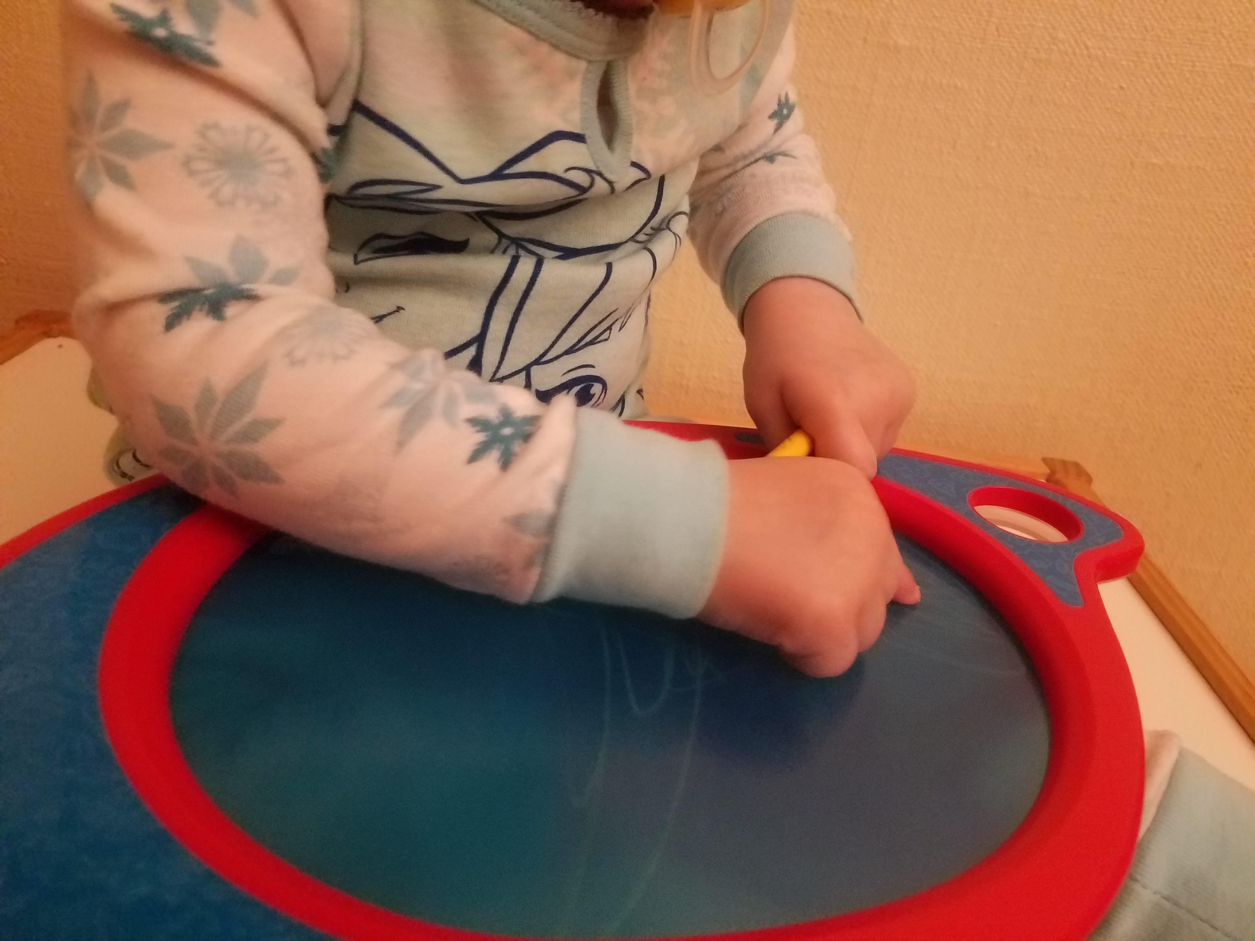 When it was Sophia’s turn to draw on the Scribble n’ Play Boogie Board, she had lots of fun using her imagination to create a masterpiece. She drew spirals as the top of trees and drew lines for the trunk of the trees. Sophia’s creativity has also increased recently. Sometimes she likes to sit down and create a fun picture. Last week she drew a horse with wavy hair over a pool of lava. Before she told me it was a horse, I actually thought it looked like one. Adding the lava to the picture was very imaginative.