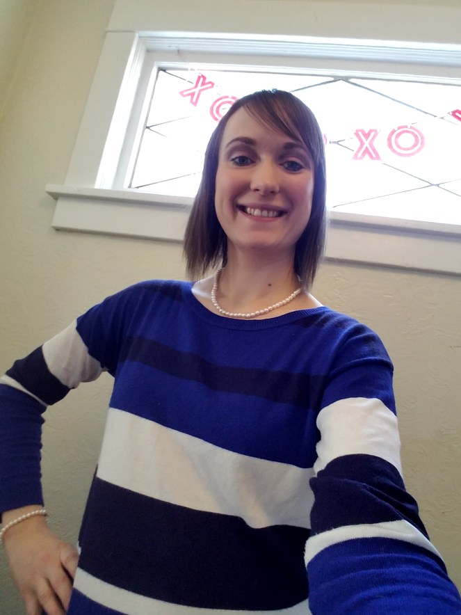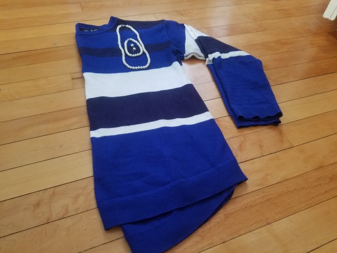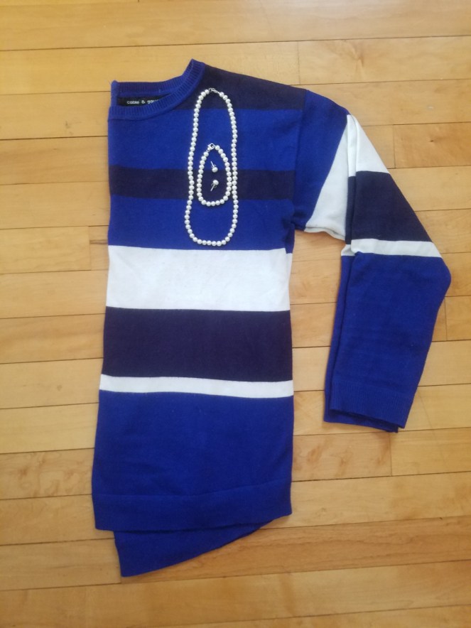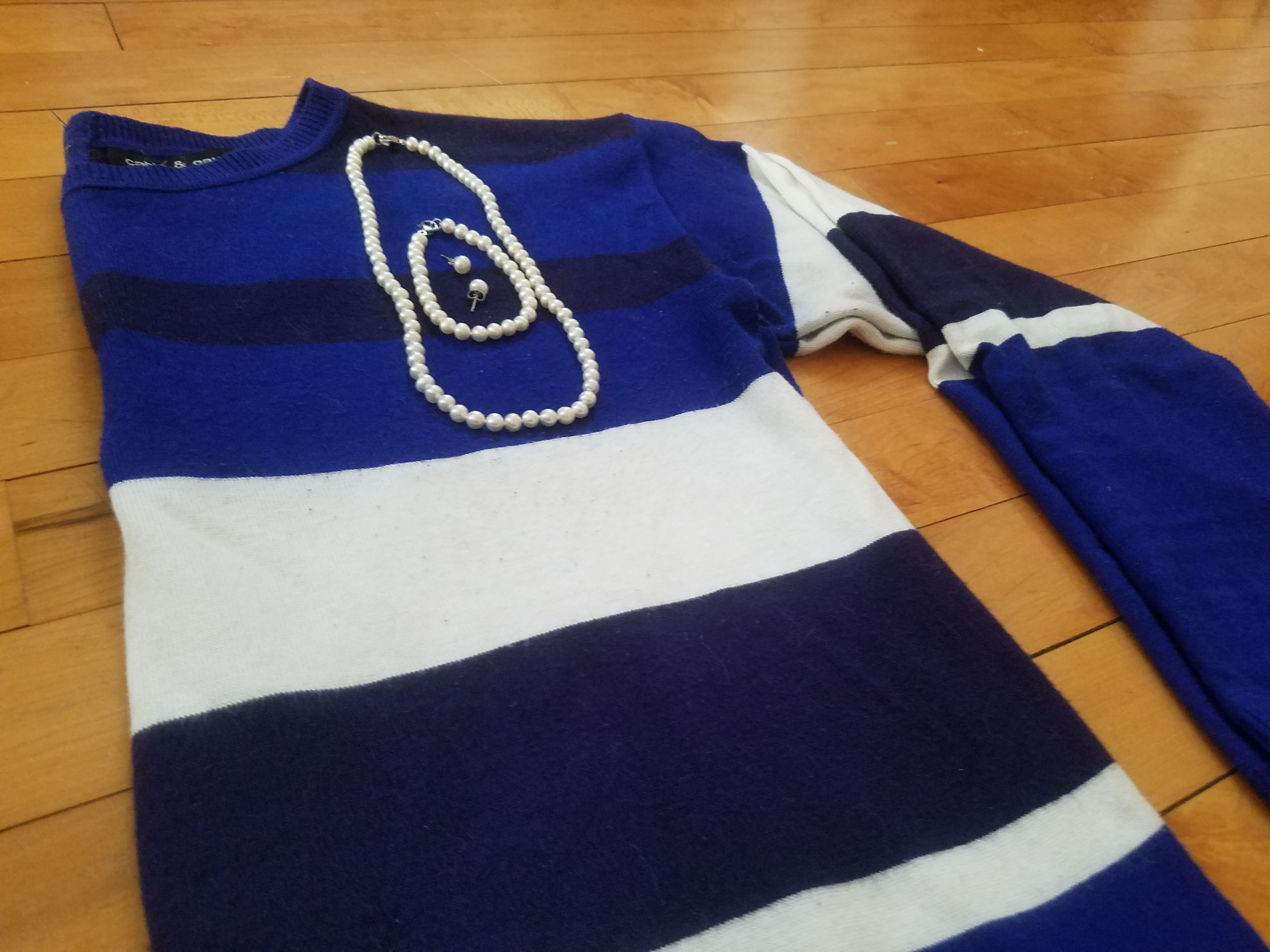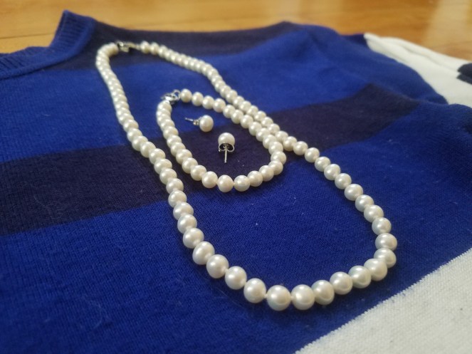 I decided to wear my pearl jewelry set with a navy blue and white striped sweater. It looks very classic against the navy blue. The sweater is a Cable & Gauge top that I bought at TJ Maxx.