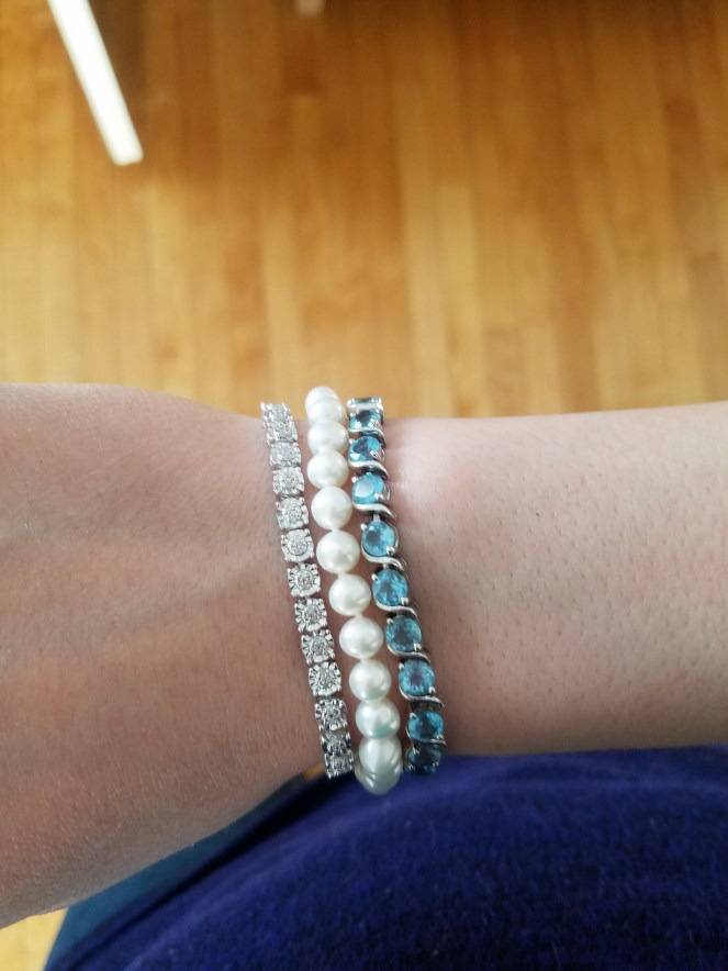 I also wore the pearl jewelry set for Valentine’s Day. I wore them with a blue and gold top. I paired my pearl bracelet with my white diamond and blue jeweled bracelets. I got the white diamond bracelet (along with matching earrings) for Christmas. I got the blue jeweled bracelet for Valentine’s Day few years ago.