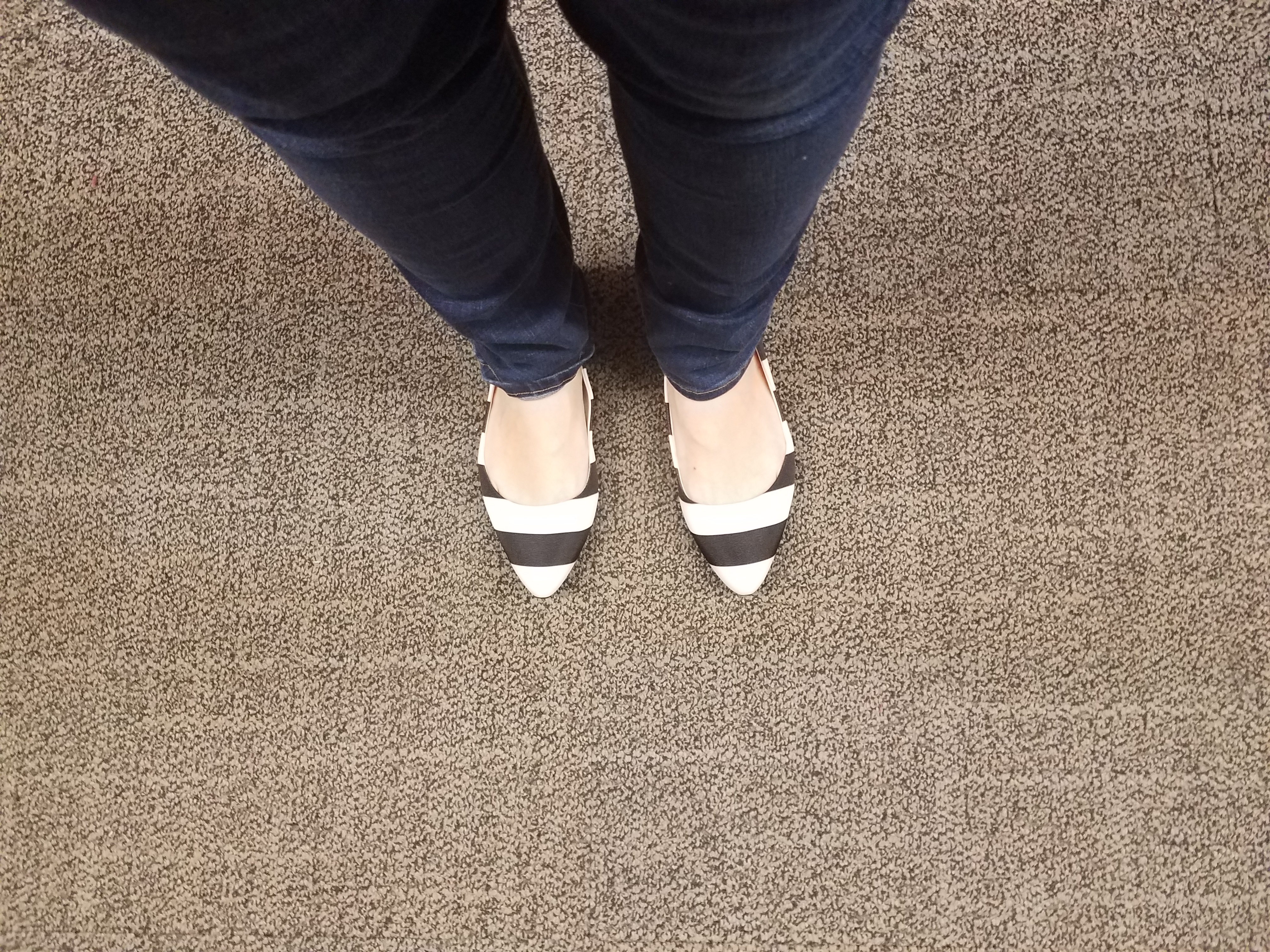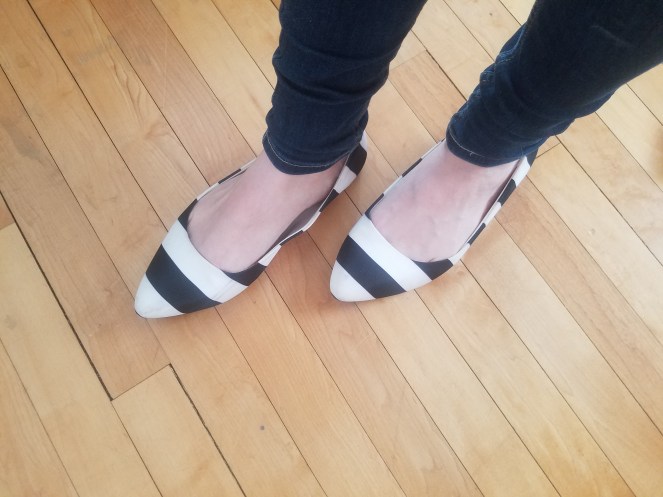 These skinny striped flats on DSW are very similar to my striped flats. The black and white stripes on my pair are wider than this pair. If you would like a pair of striped flats, these would be a great choice! You can see how much I love stripes here.