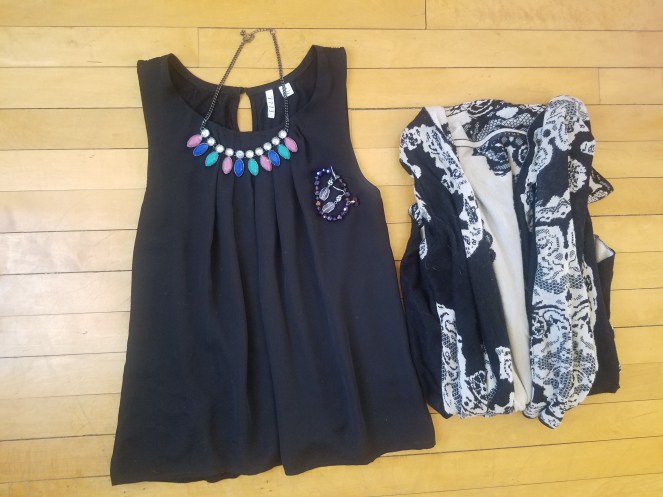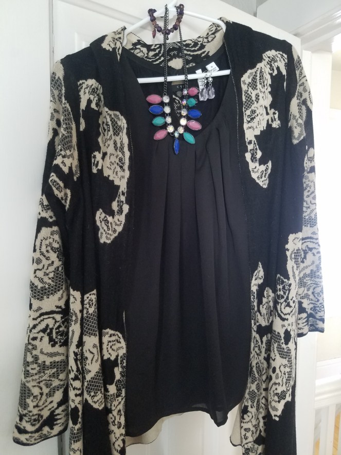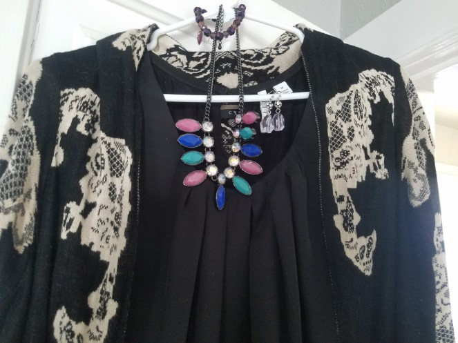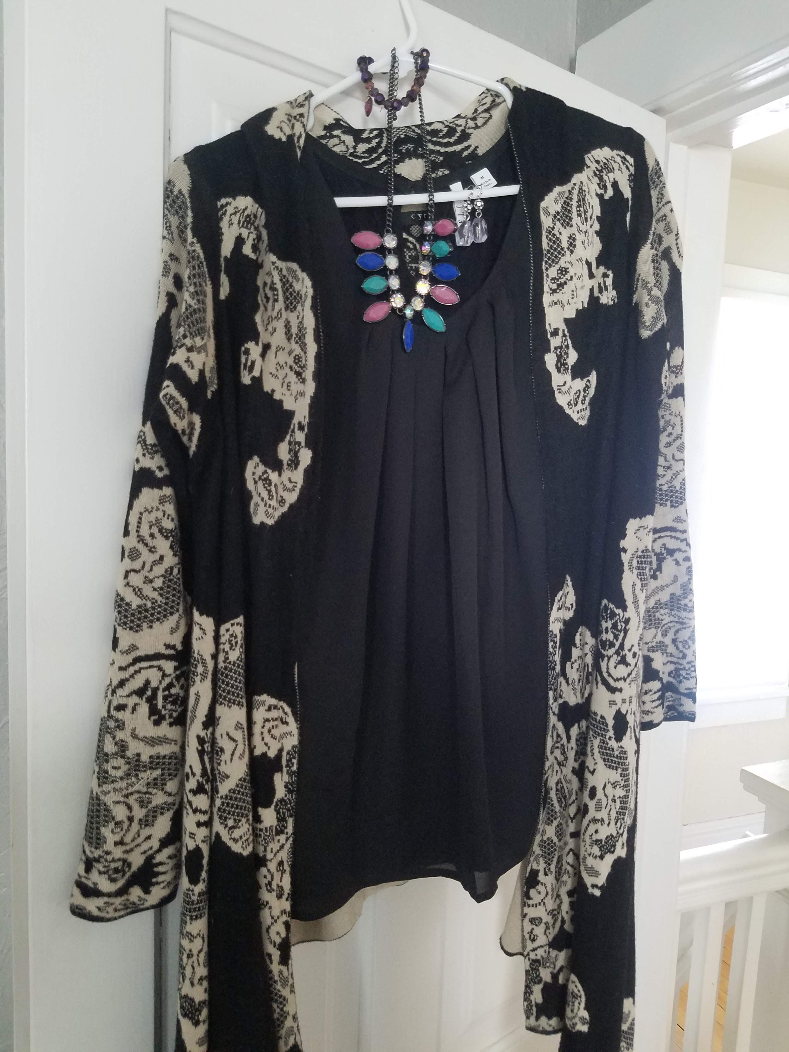 What are you going to wear to dress up while wearing jeans? What do you think of my black blouse paired with the cardigan and jewelry?