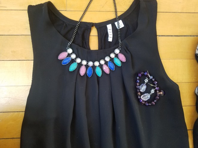 I like the necklace with the colors best. I think the pop of color looks good with the black.