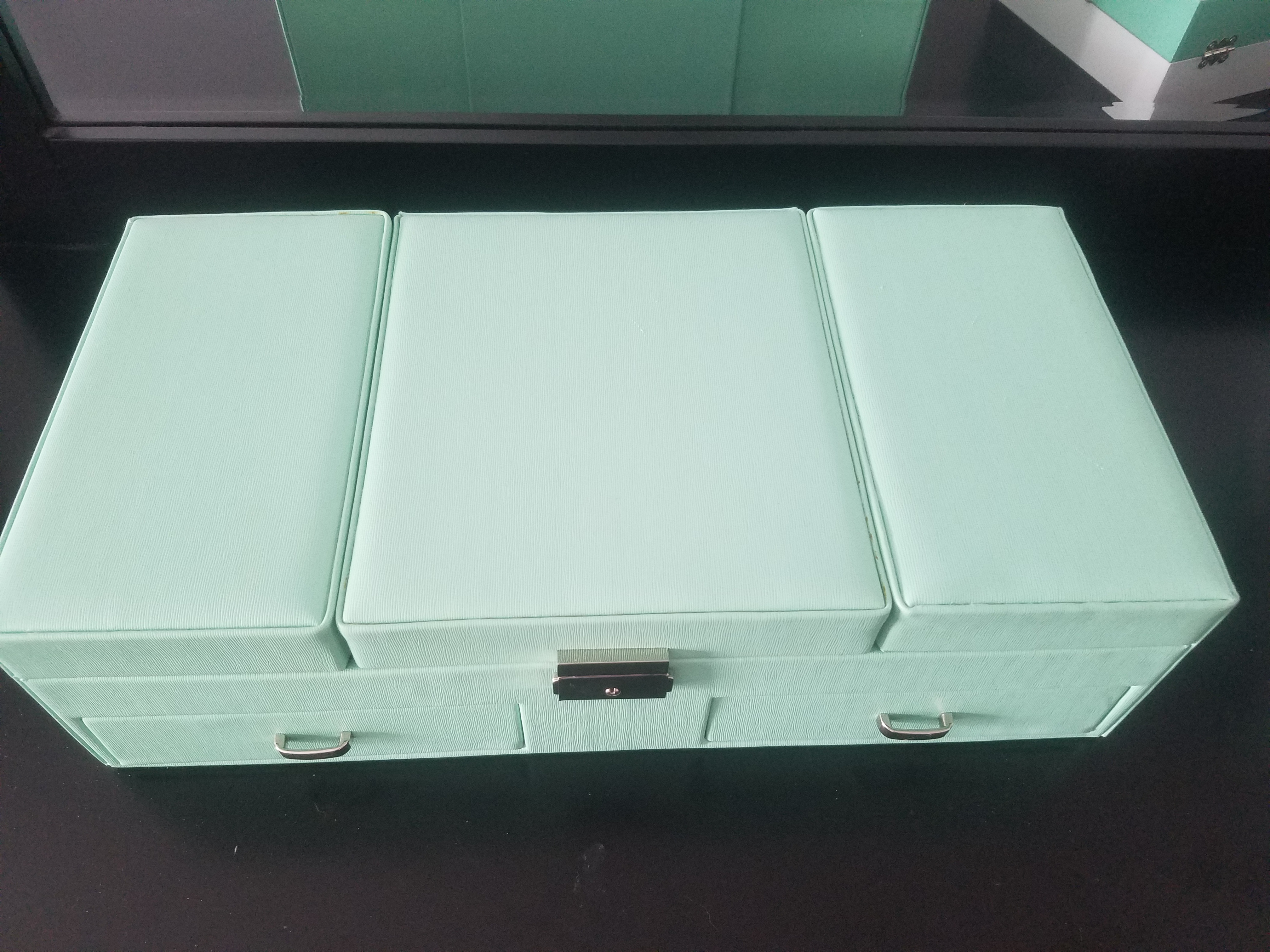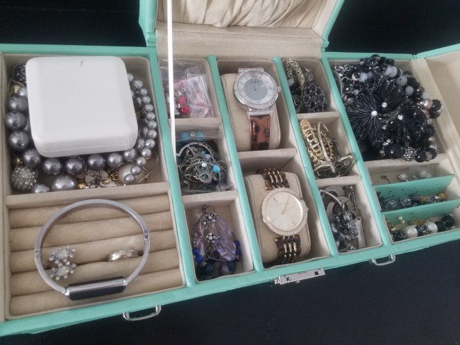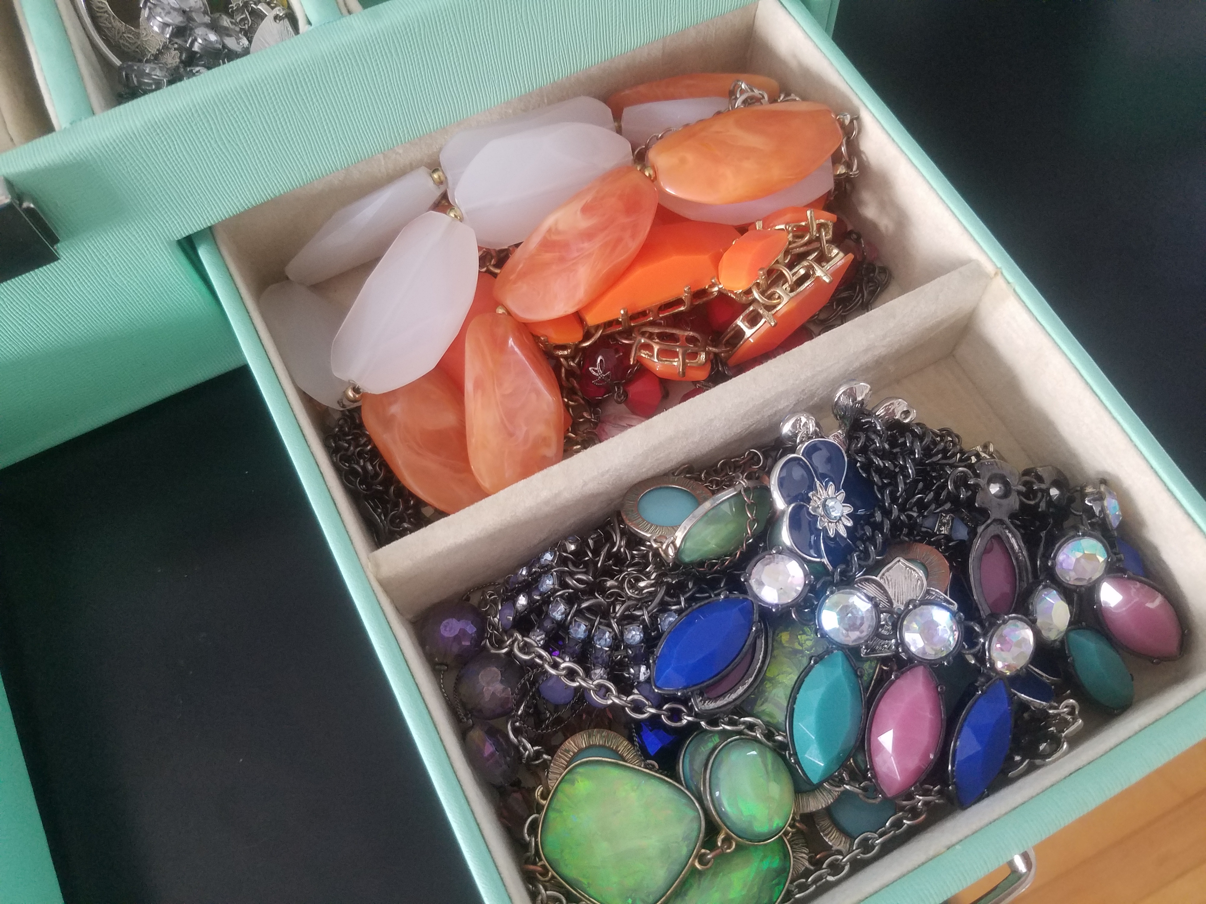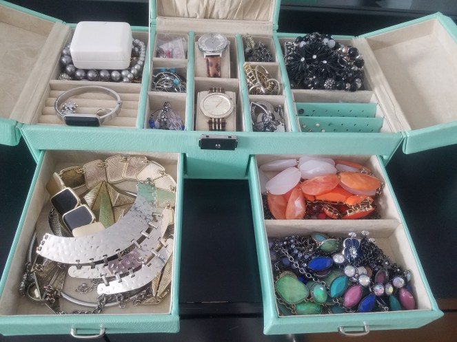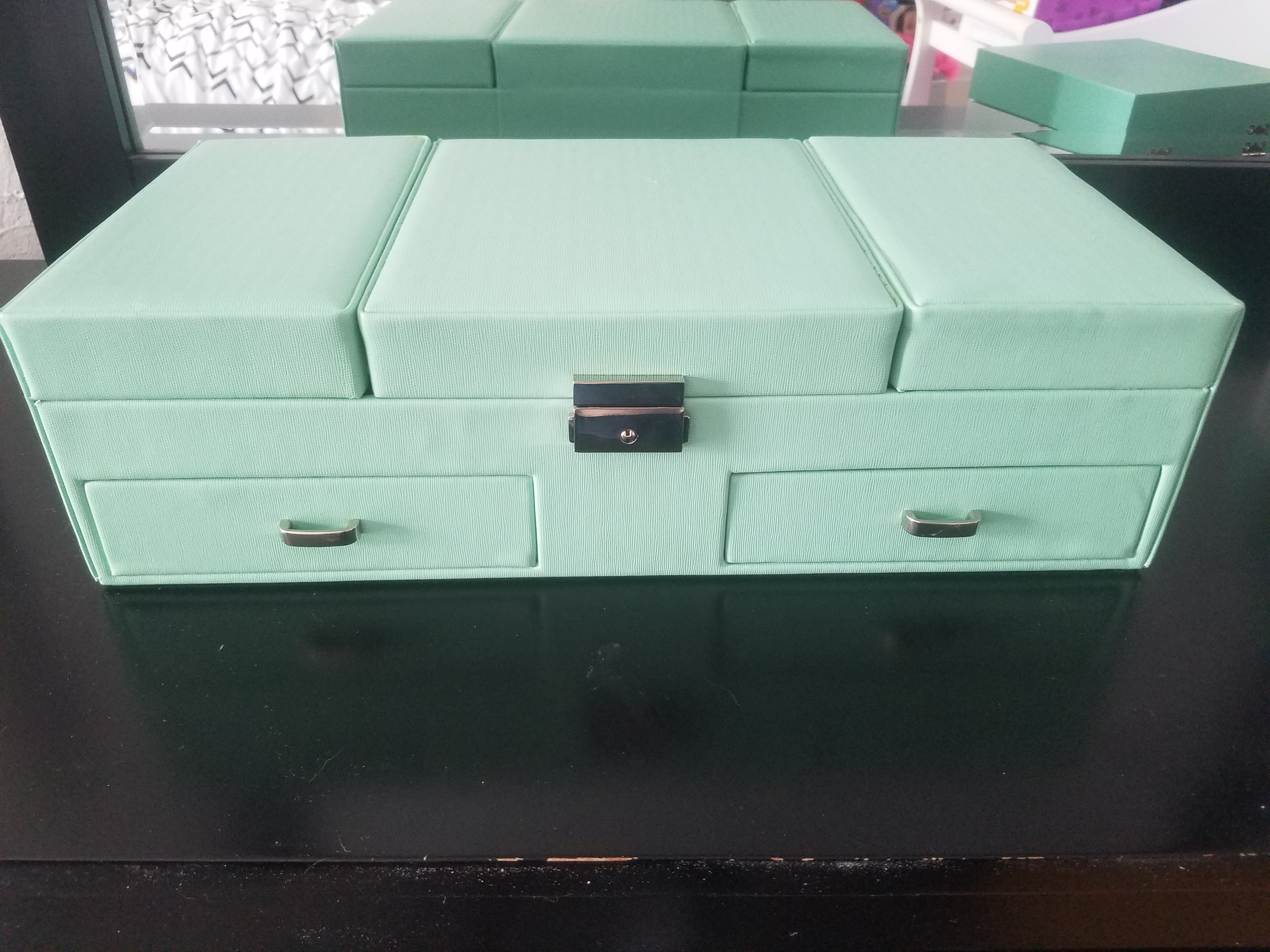 The mint jewelry box has many areas to store jewelry including on the top and front drawers. I store some of my necklaces, earrings, rings, and watches in the top. In the front drawers, I store the rest of my necklaces. I organize my necklaces and earrings by color.