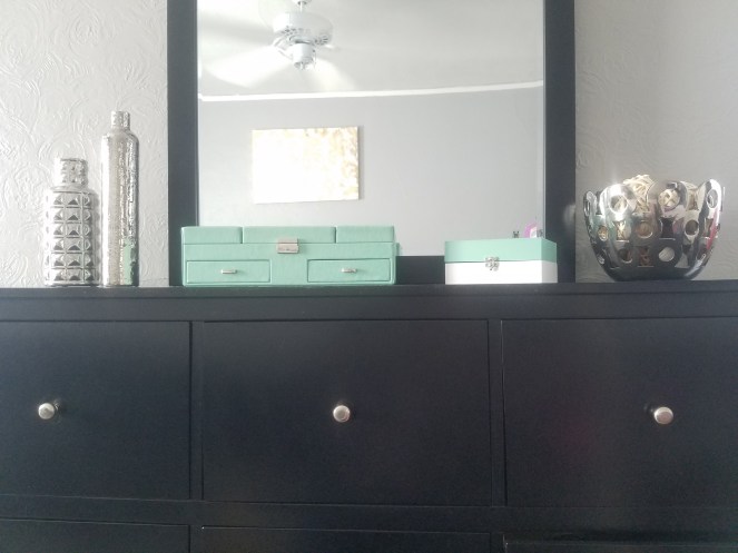 I shared with you on the blog in a different post on jewelry organization. I kept my jewelry in three separate containers. The containers had designs on it and the jewelry was able to be displayed on my dresser.