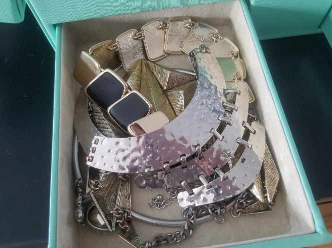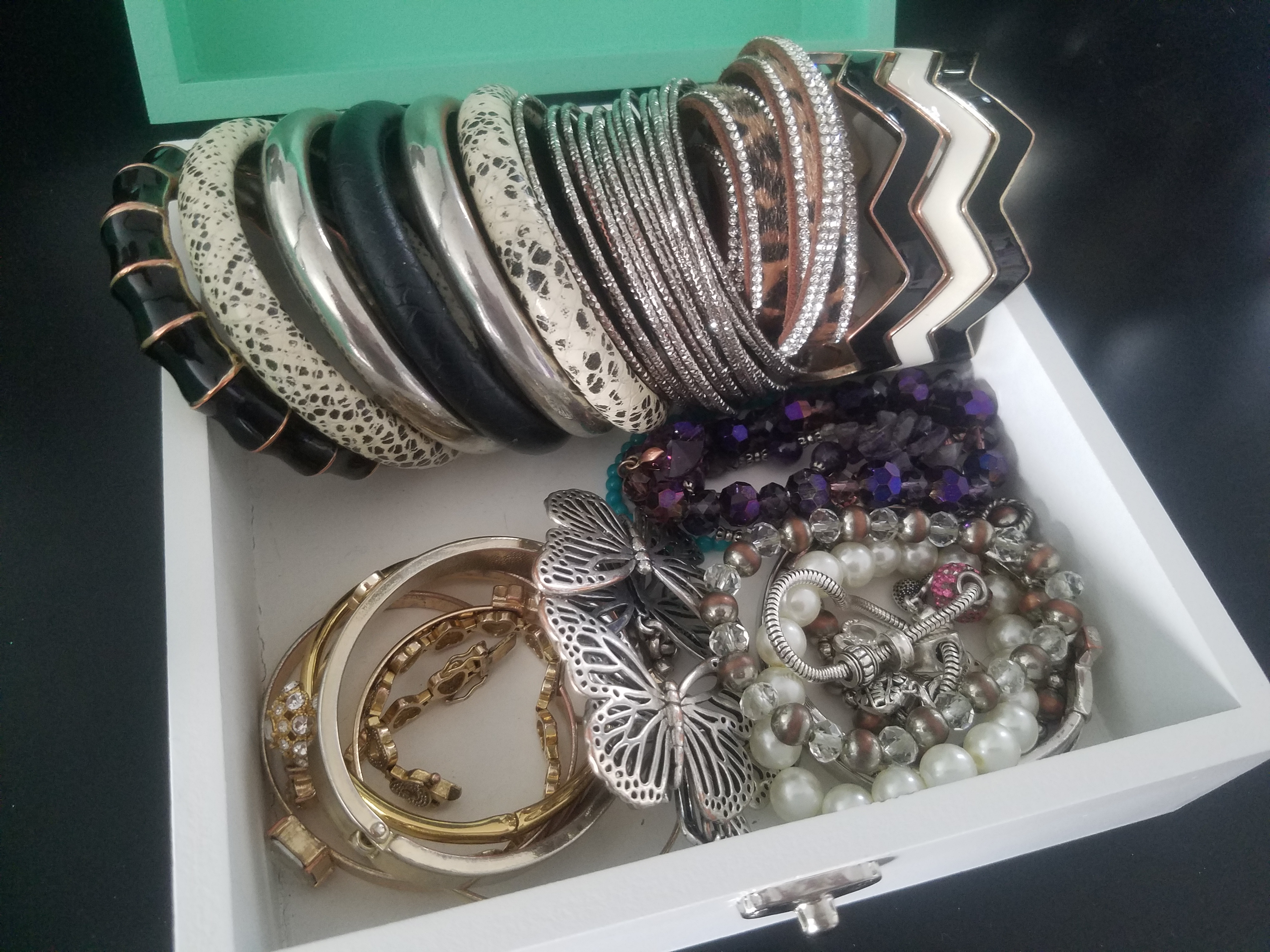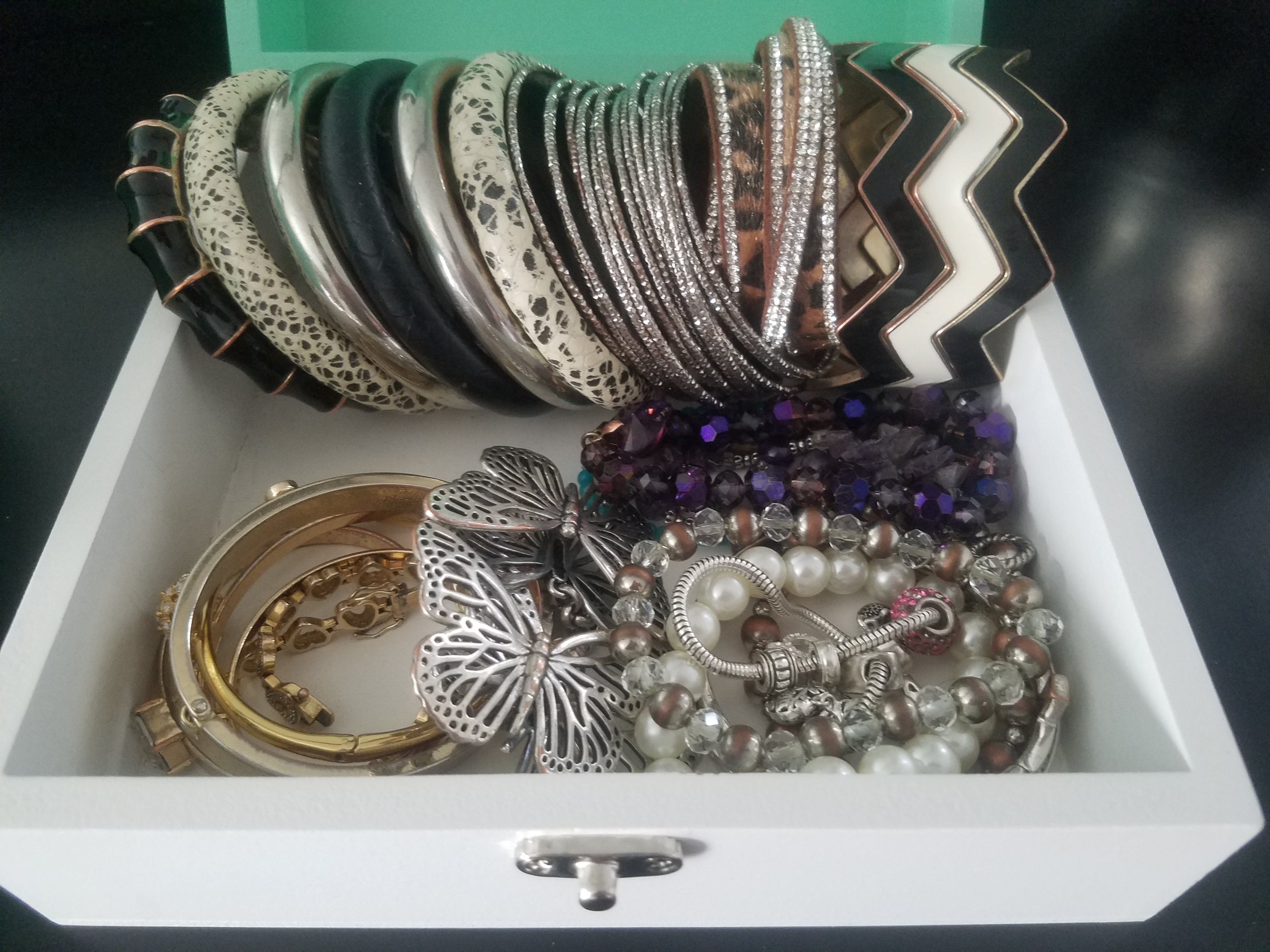 The small mint and white box works great for my bracelets. I organize my bracelets by size. My bigger bracelets are in the back of the box. The smaller ones are in the front and organized by color.