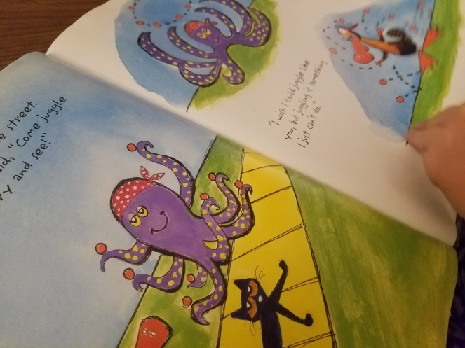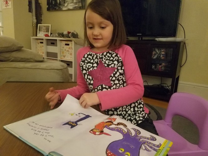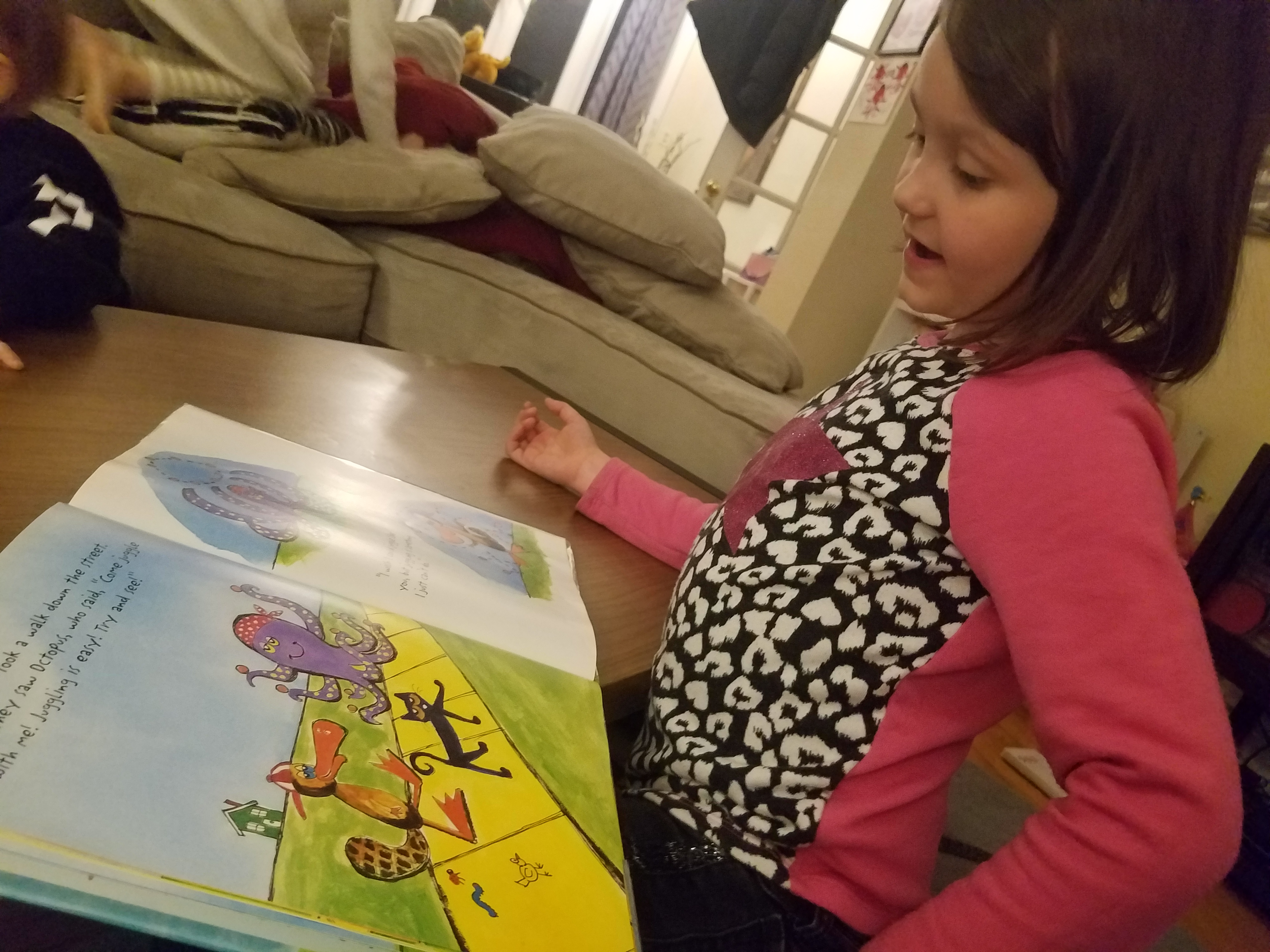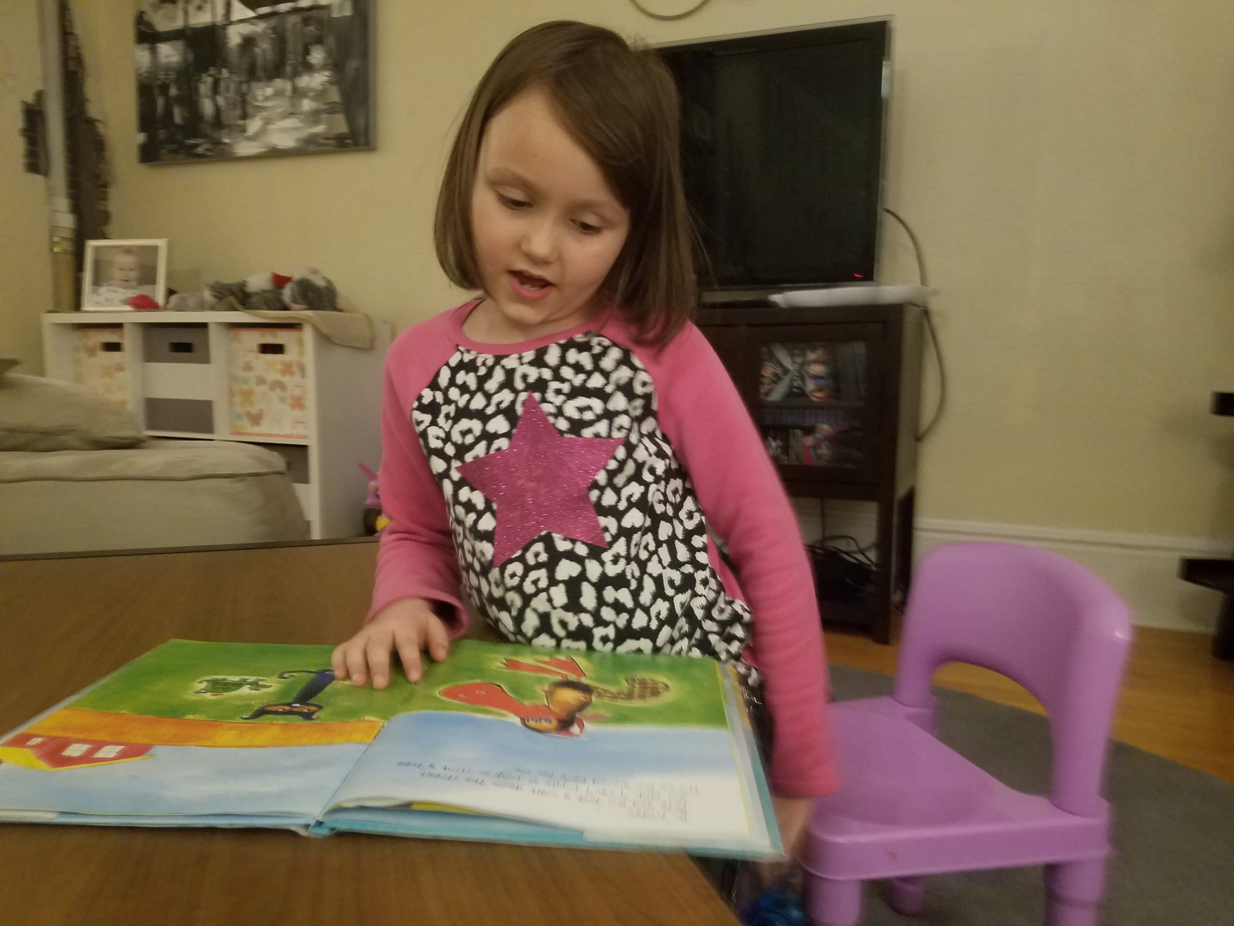 Last week, we read Katie’s library book, Pete the Cat and the New Guy, she checked out from the library at school. After we read the book, I started reading a book my daughter Sophia picked. While we were reading, Katie picked up her library book and started reading it by herself. I followed along with her while she was reading her book. There were some words she stumbled on, so I covered up part of the word and had her sound the word out.
