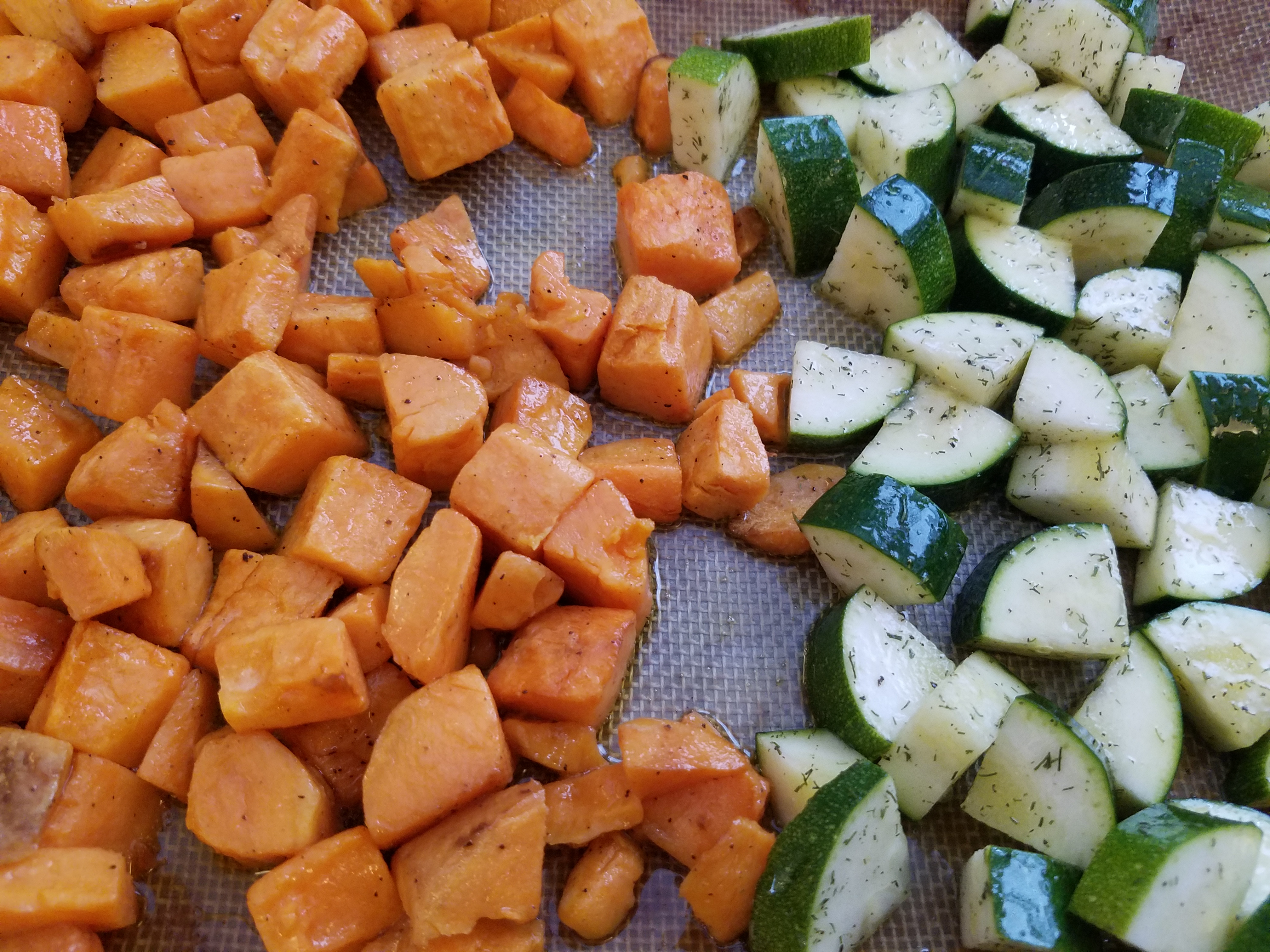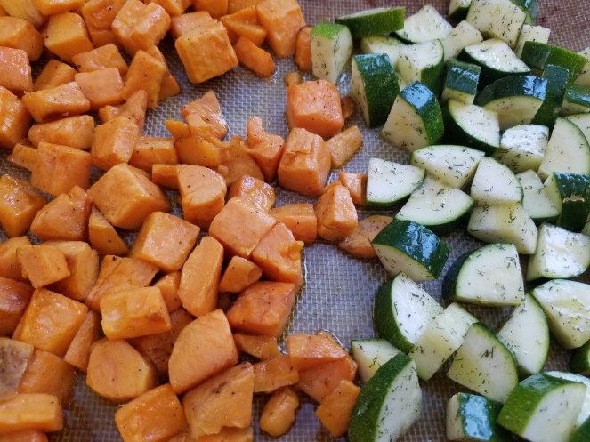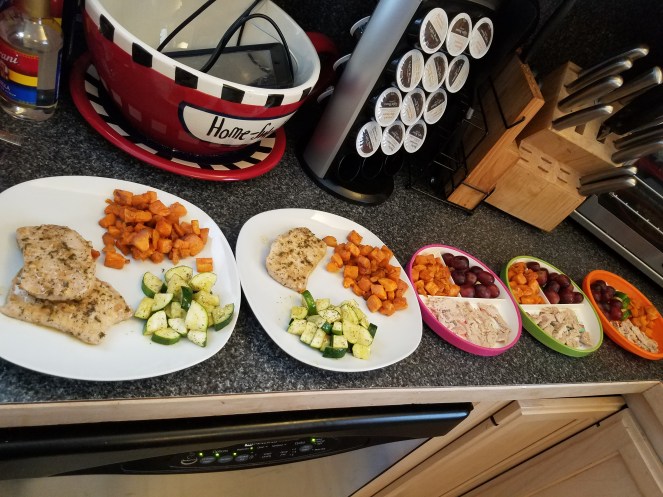 2. Add fruit or vegetable you know your kids will eat. I’ll add an extra item to their plate along with the vegetable my husband and I are eating. Sometimes I’ll even add a fruit yogurt pouch to have with their meal. In the example below, I gave my girls diced sweet potatoes with a sprinkle of cinnamon on top along with some grapes.