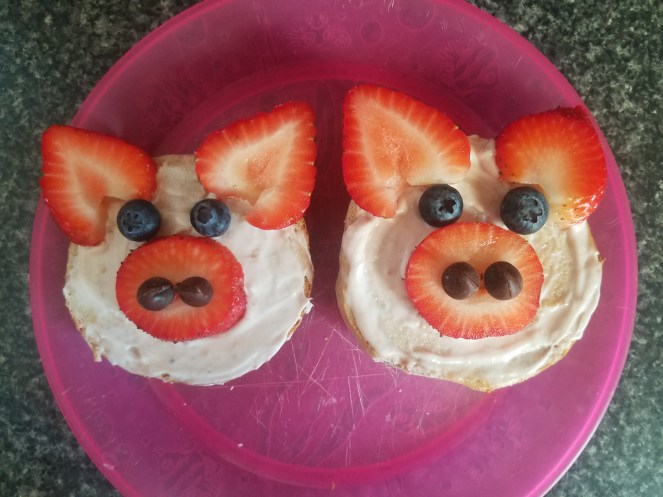 Before we did anything in the box, that morning I made pig bagels for my oldest daughter, Katie. She is the only one who likes cream cheese. I took two pieces of mini bagels and spread strawberry cream cheese on top. I sliced couple strawberries lengthwise and used four slices for ears. I sliced a strawberry widthwise and used two slices for a nose. I added four blueberries for eyes and four chocolate chips for on top of each nose. Katie loved these and ate them all up.