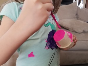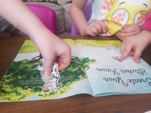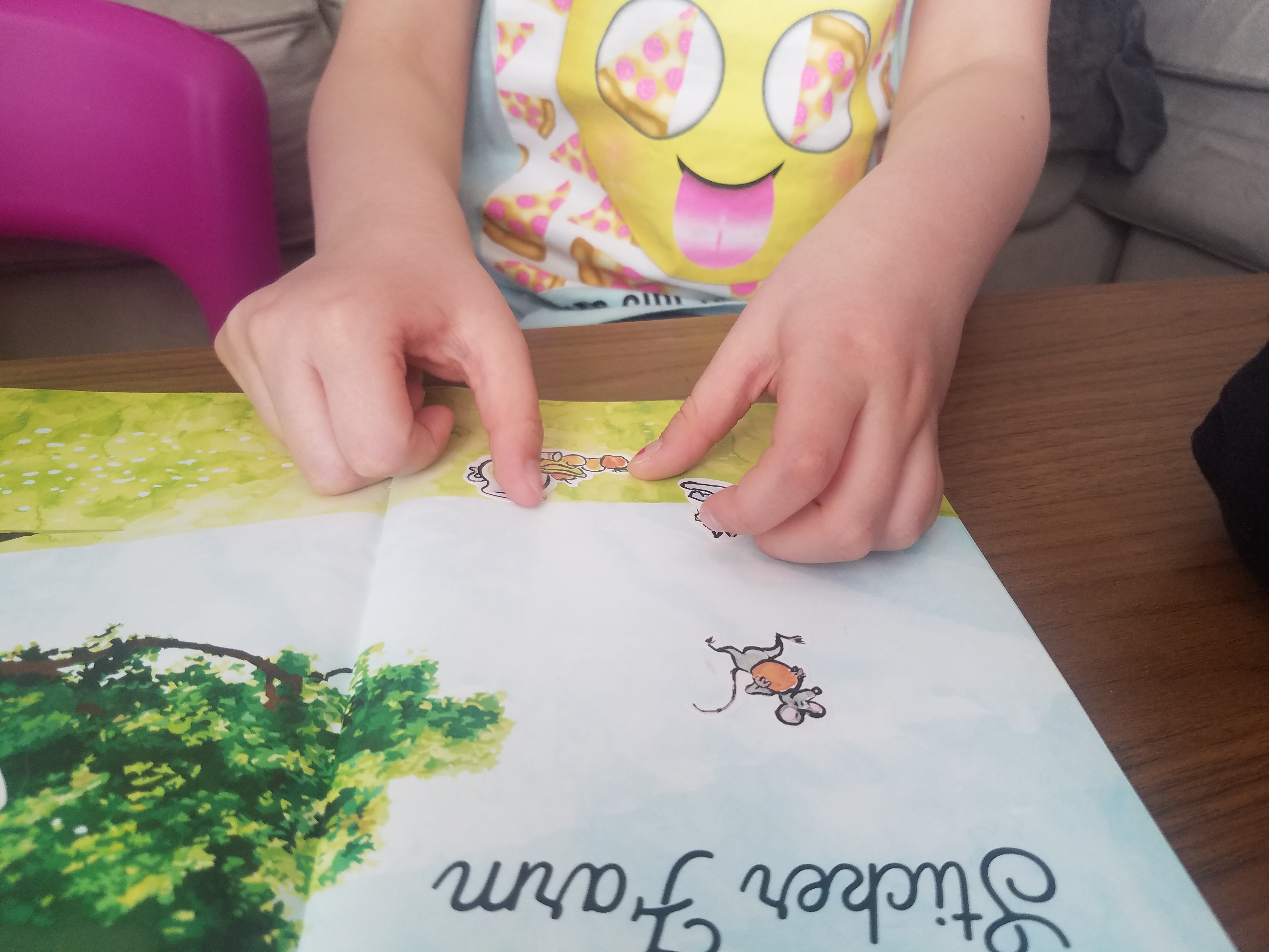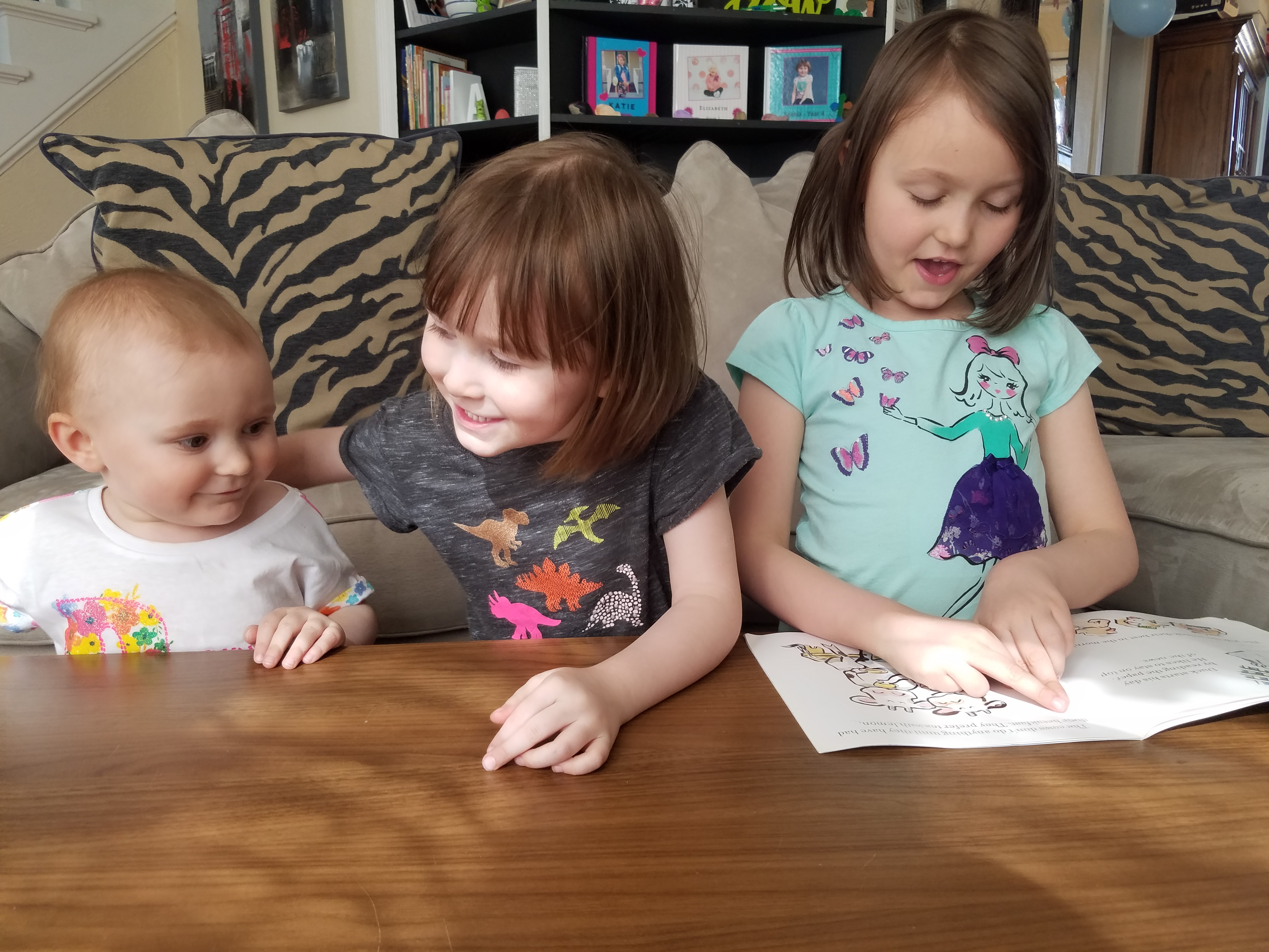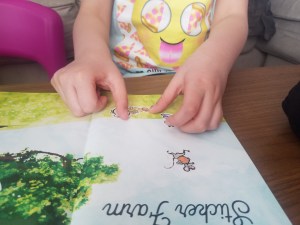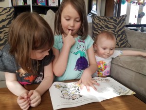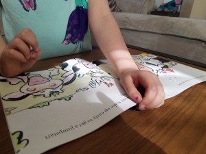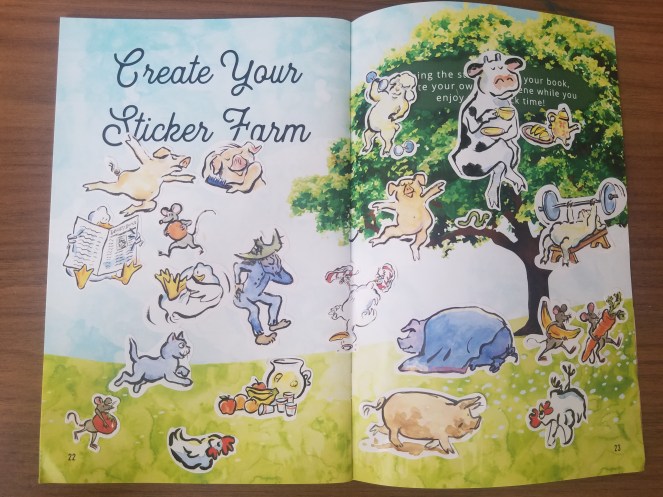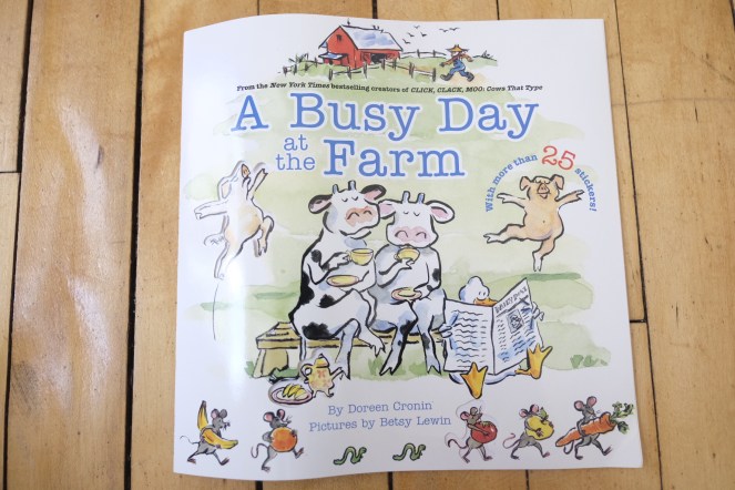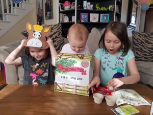 Now it was time to have some fun from the box. We started out by pulling out the book from the box, A Busy Day at the Farm by Doreen Cronin. Katie read us the book since she’s becoming a pro at reading. In the book, while the farmer is busy doing farm work, the farm animals are having fun. They are even going inside the farmer’s house to raid the fridge, take a bath, etc. My girls thought it was really funny seeing the sheep lift weights, the pigs doing ballet, the cows drinking tea, and the duck stealing the food to have a picnic with all the animals.
