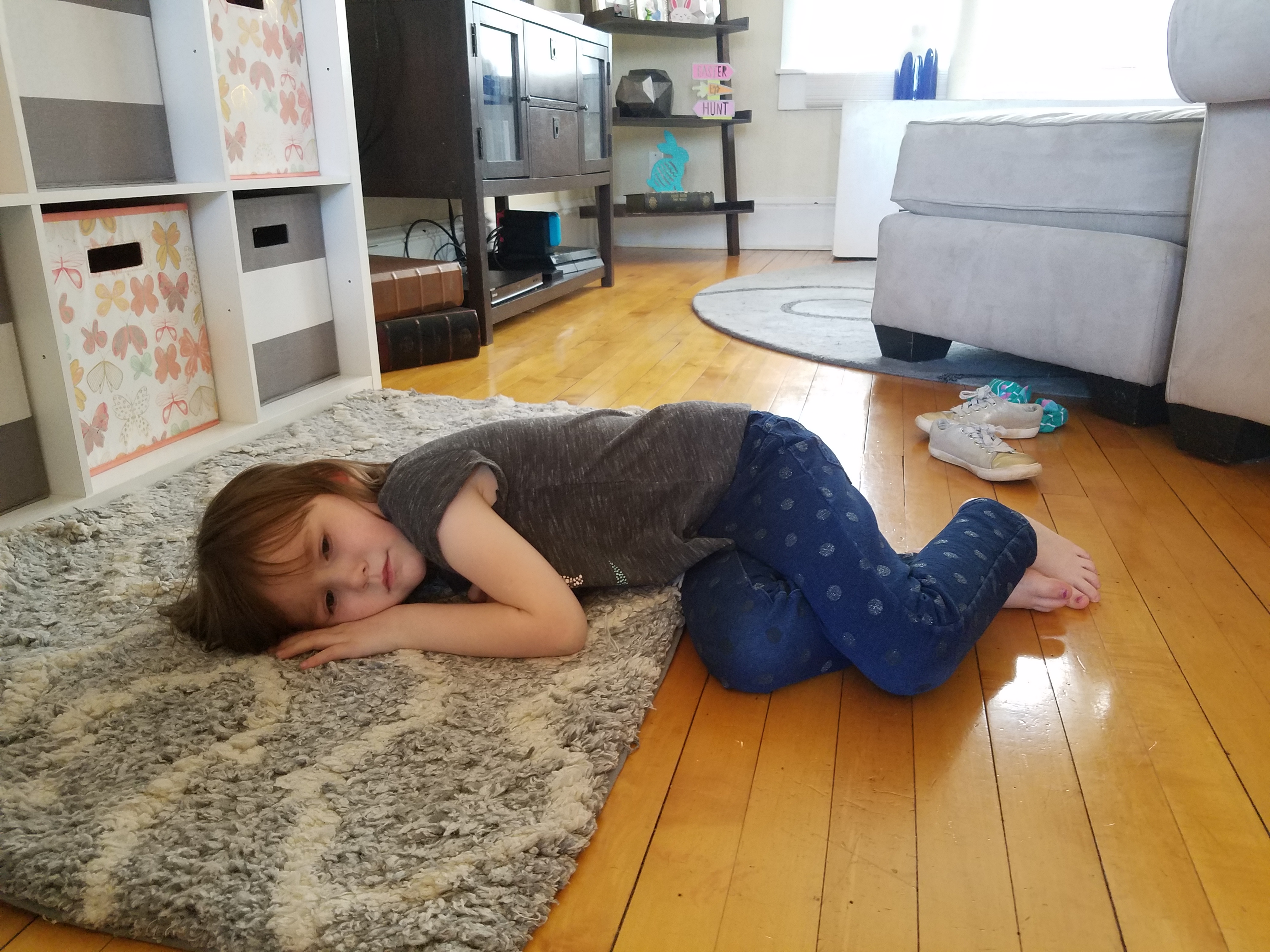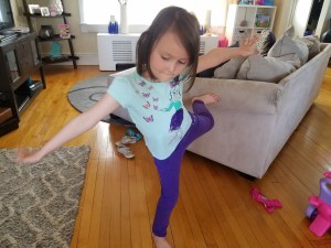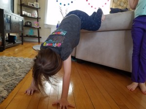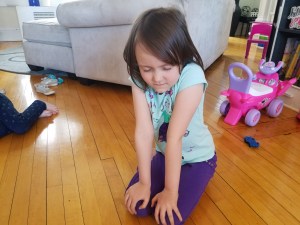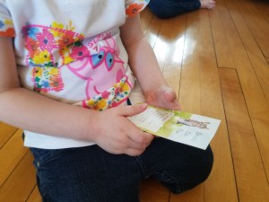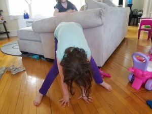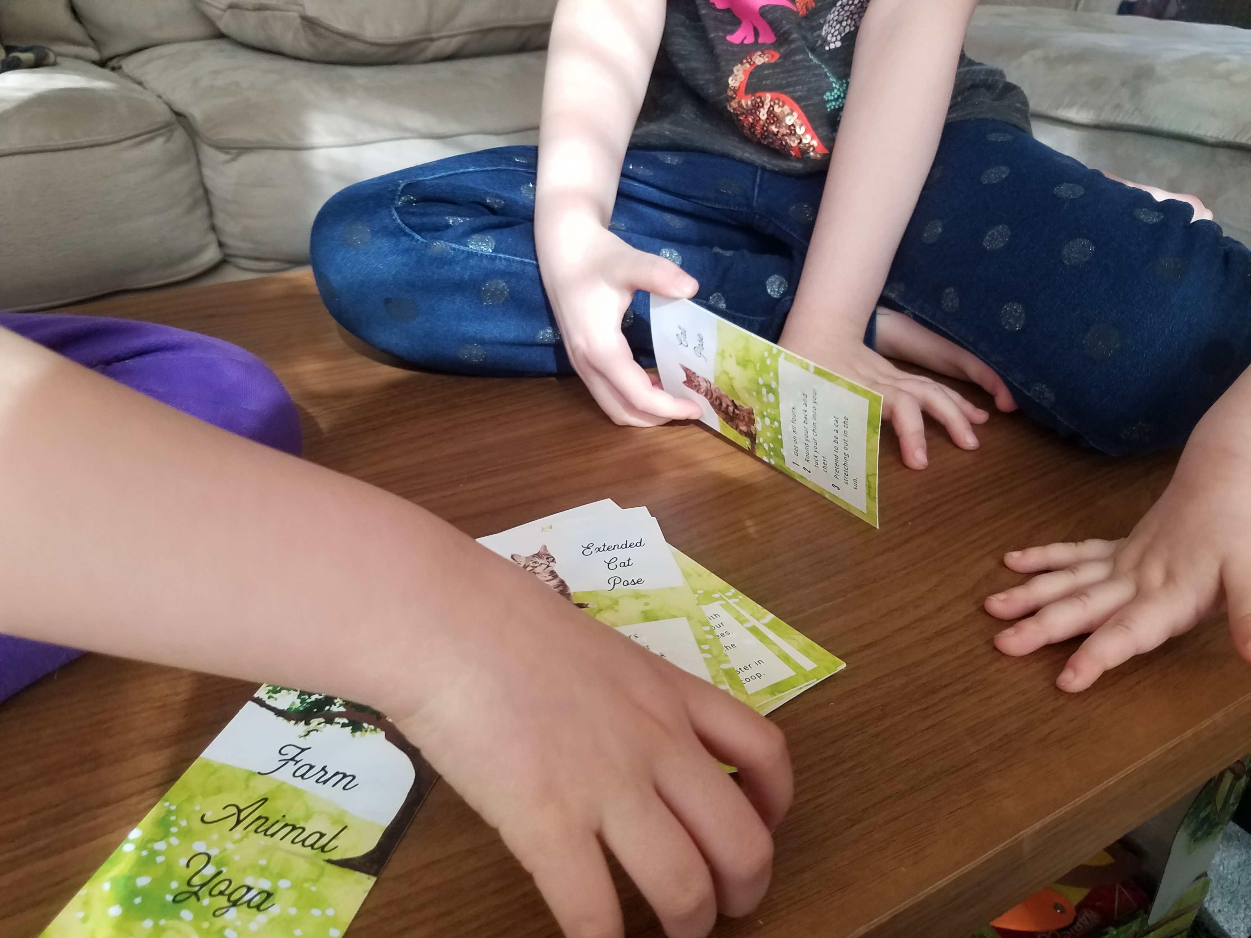 The box came with a set of cards to do some yoga poses. There were certain moves for the cat, pig, duck, etc. Katie really enjoyed doing the yoga poses with me since she has done yoga with me in the past. Sophia liked it too, but was having a little trouble doing some of the moves. I think that of her problem was that she was getting tired from waking up early that morning. So we took a little break to play outside.