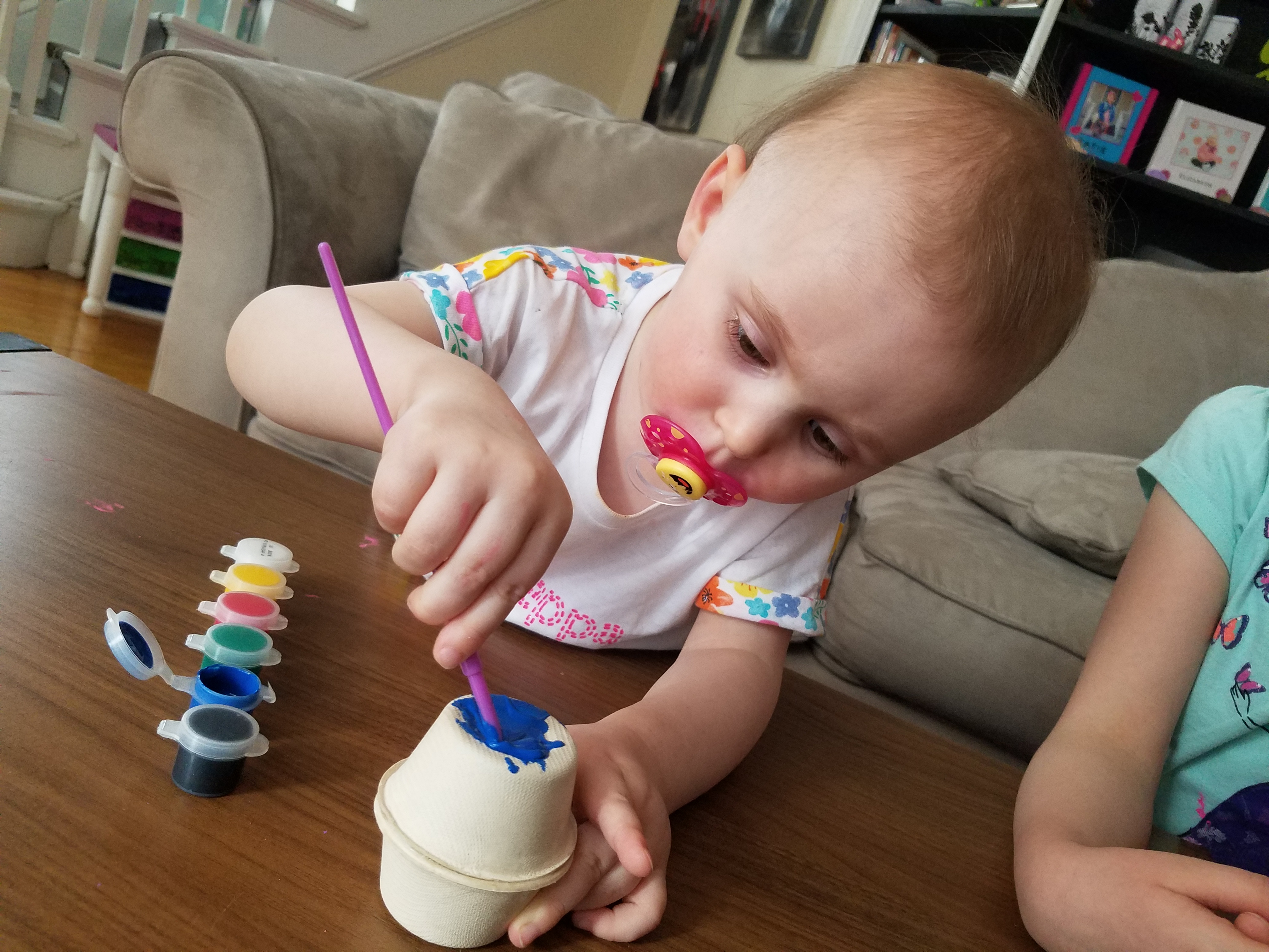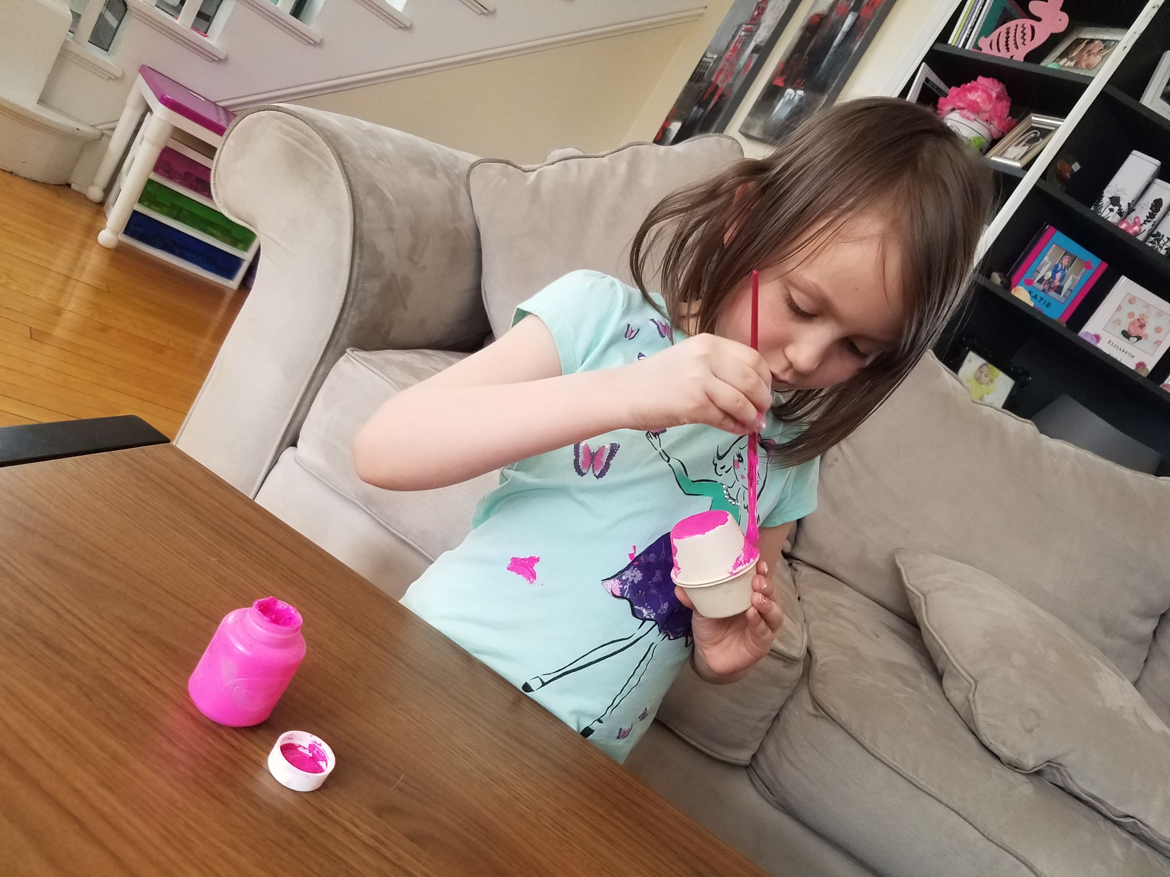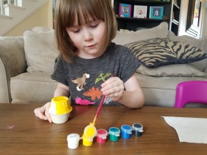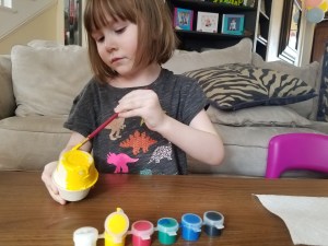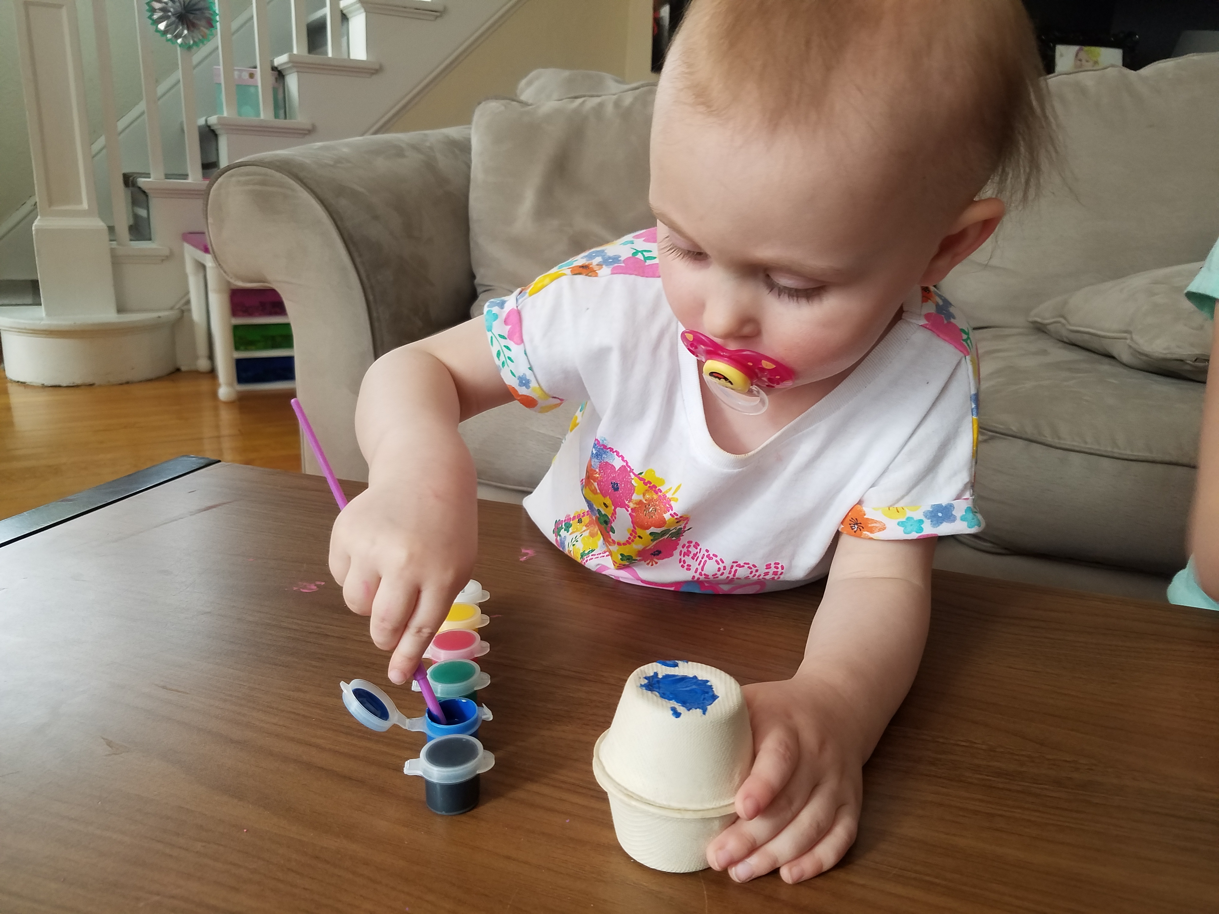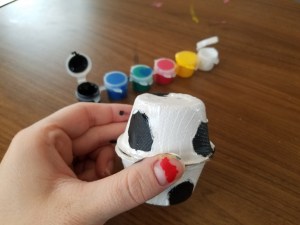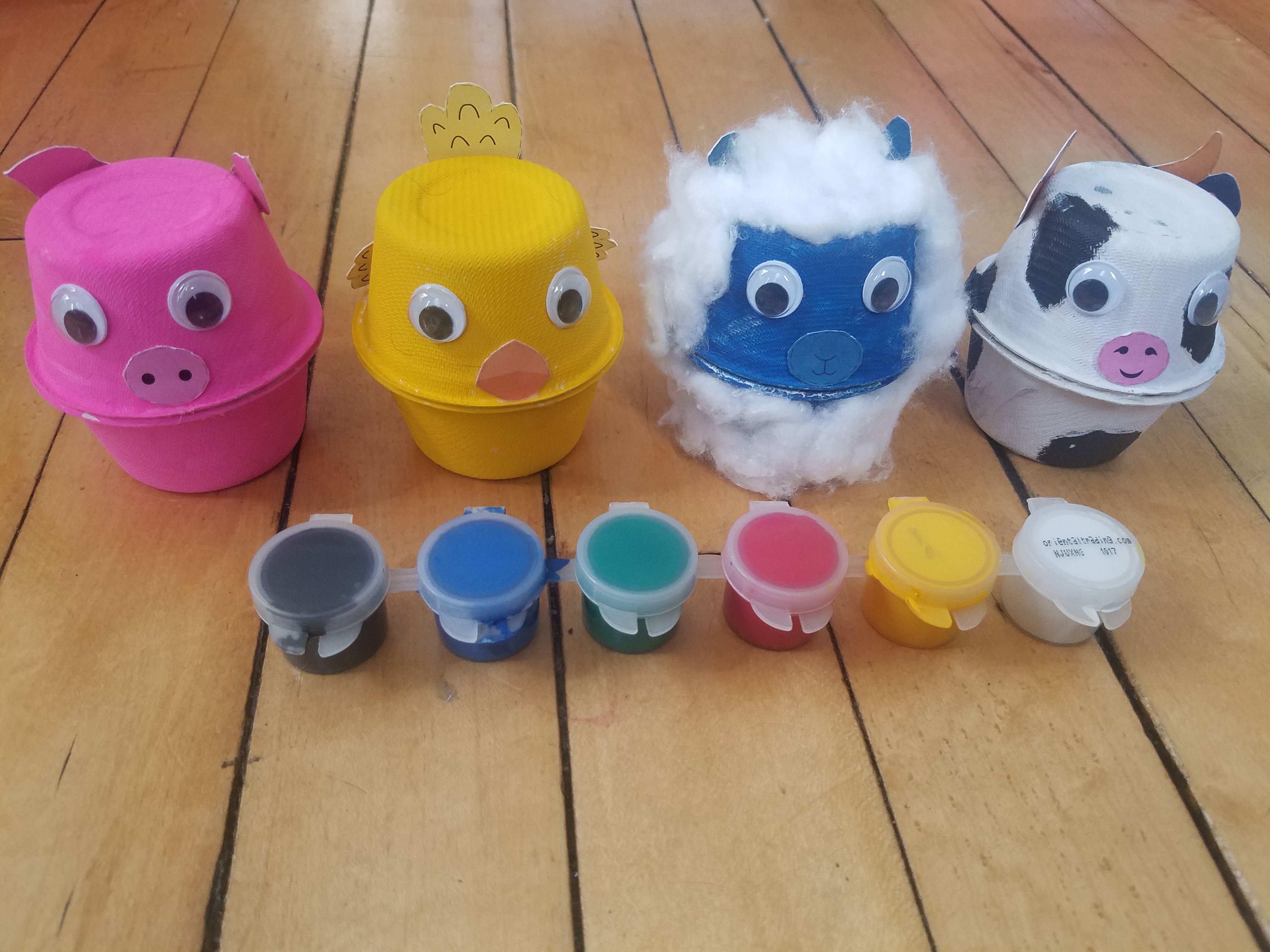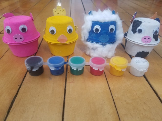 My girls had lots of fun with this activity. There were plenty of egg cartons to make four different farm animals. Katie picked the pig, Sophia picked the duck, Elizabeth picked the sheep, and I picked the cow. We started out by gluing the two egg carton pieces together. Once that was dry, my girls painted their egg cartons. We added the eyes, nose, and ears onto the carton once the paint was dry. Each animal turned out really cute and we have them displayed on our built-in bookshelf in our living room. Elizabeth likes to point at them and say who’s animal is who’s.