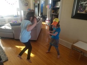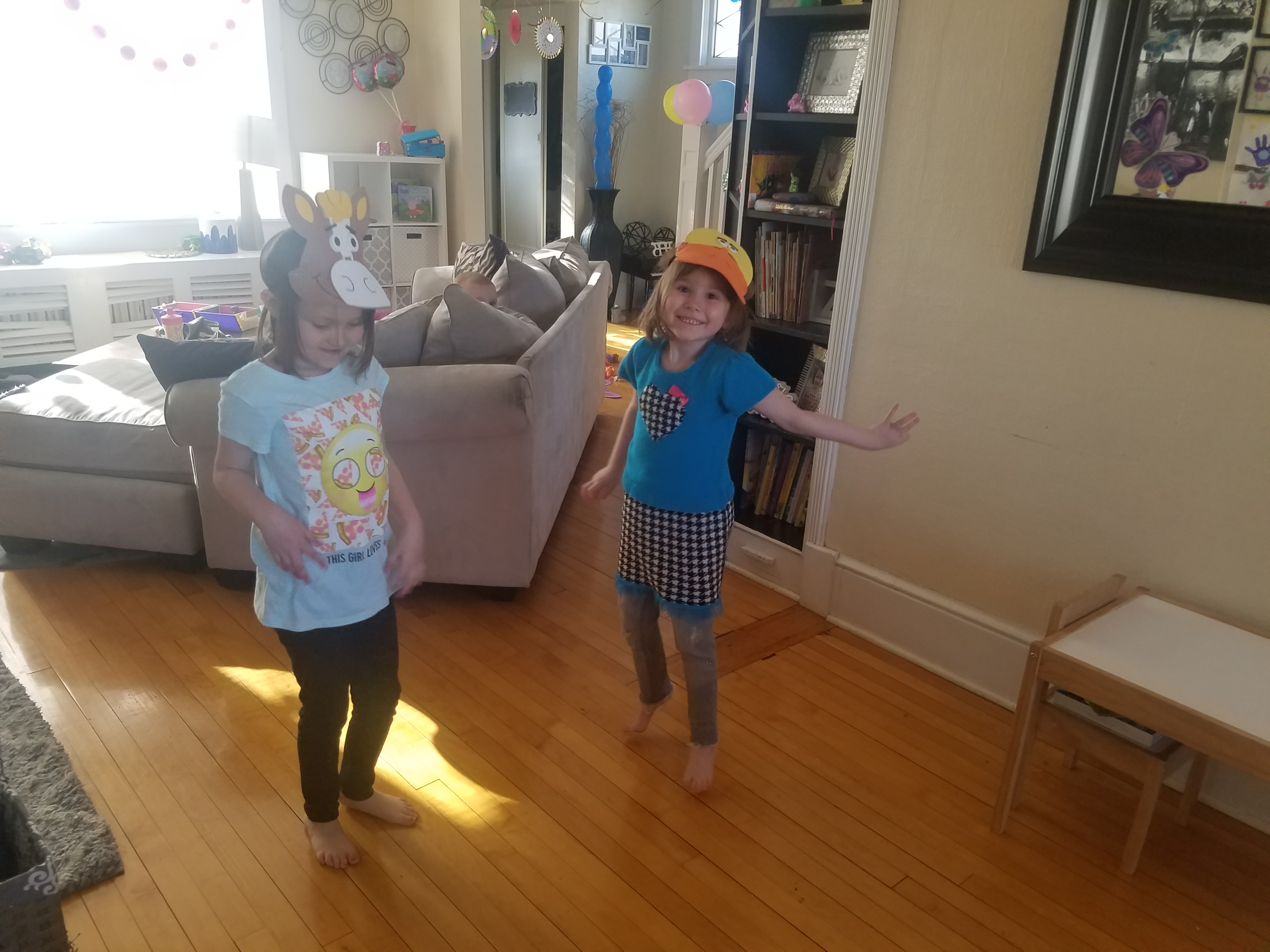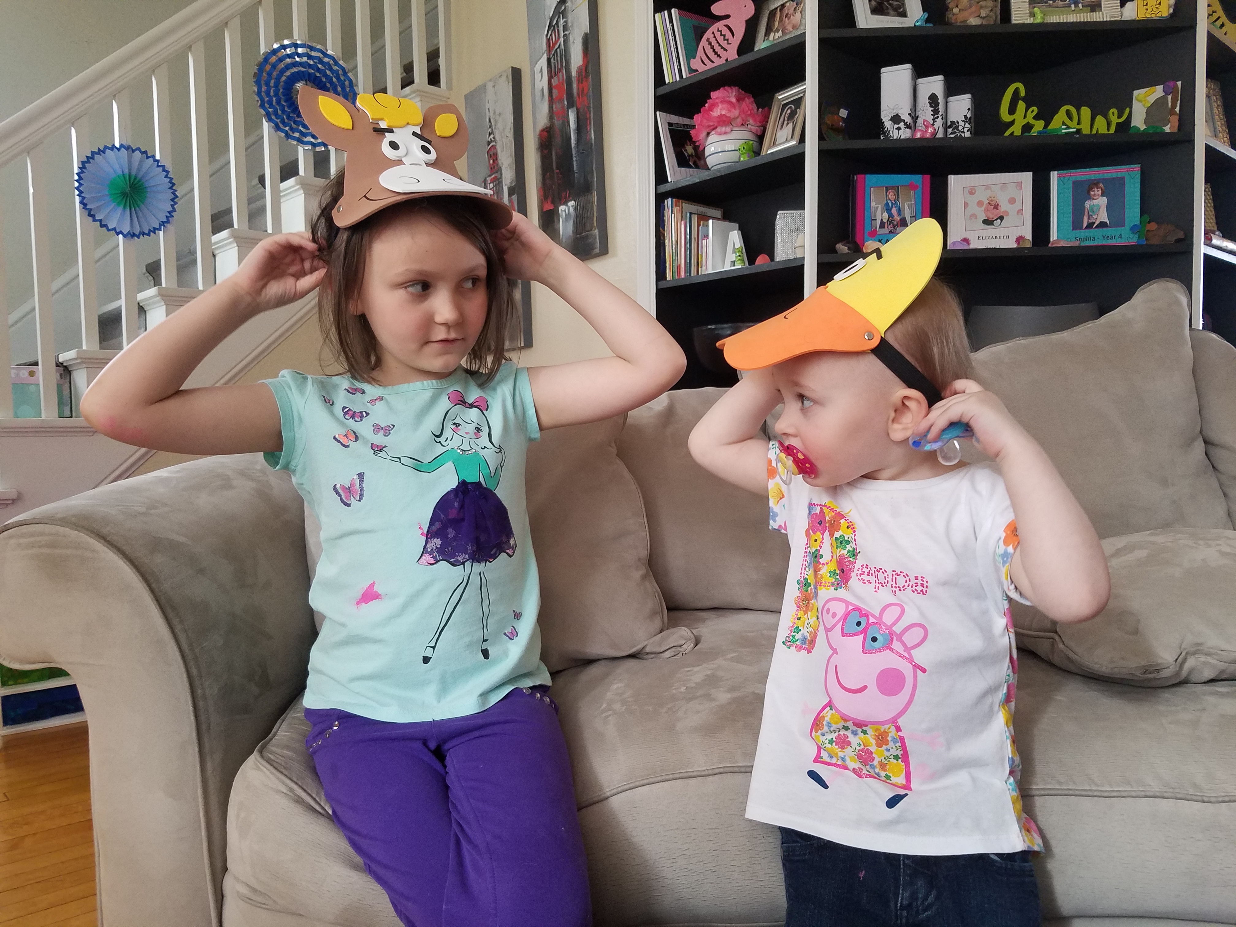 Katie and Sophia put on the horse and duck visors that was included in the box. Then they got to dance to the music for a farm animal hoedown. They had lots of fun and thought the music was silly.