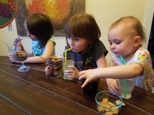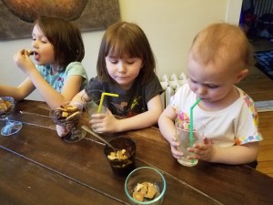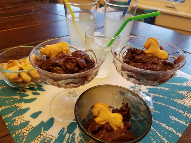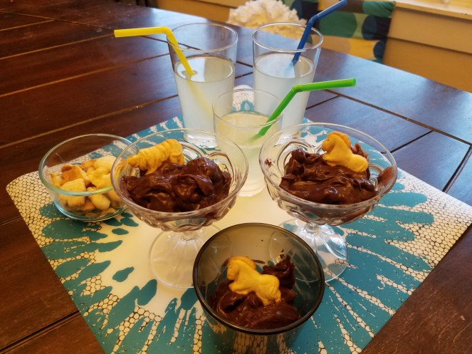 After dinner, we had snack time before bed. We made lemonade and poured it into our glasses. Just like when the farm animals drank lemonade for their picnic in the book we read. The box also came with animal crackers. I bought chocolate pudding to be the mud for the animals. My girls loved dipping their animals crackers into the pretend mud and eating the crackers and chocolate pudding.